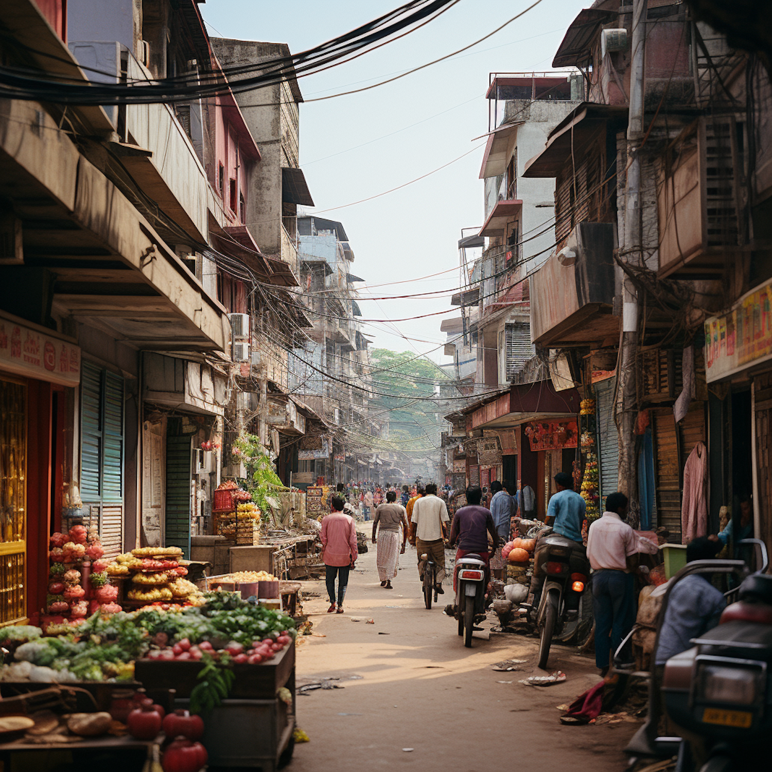 Vibrant urban market street with people, motorcycles, and fresh produce stalls under a web of overhead wires.