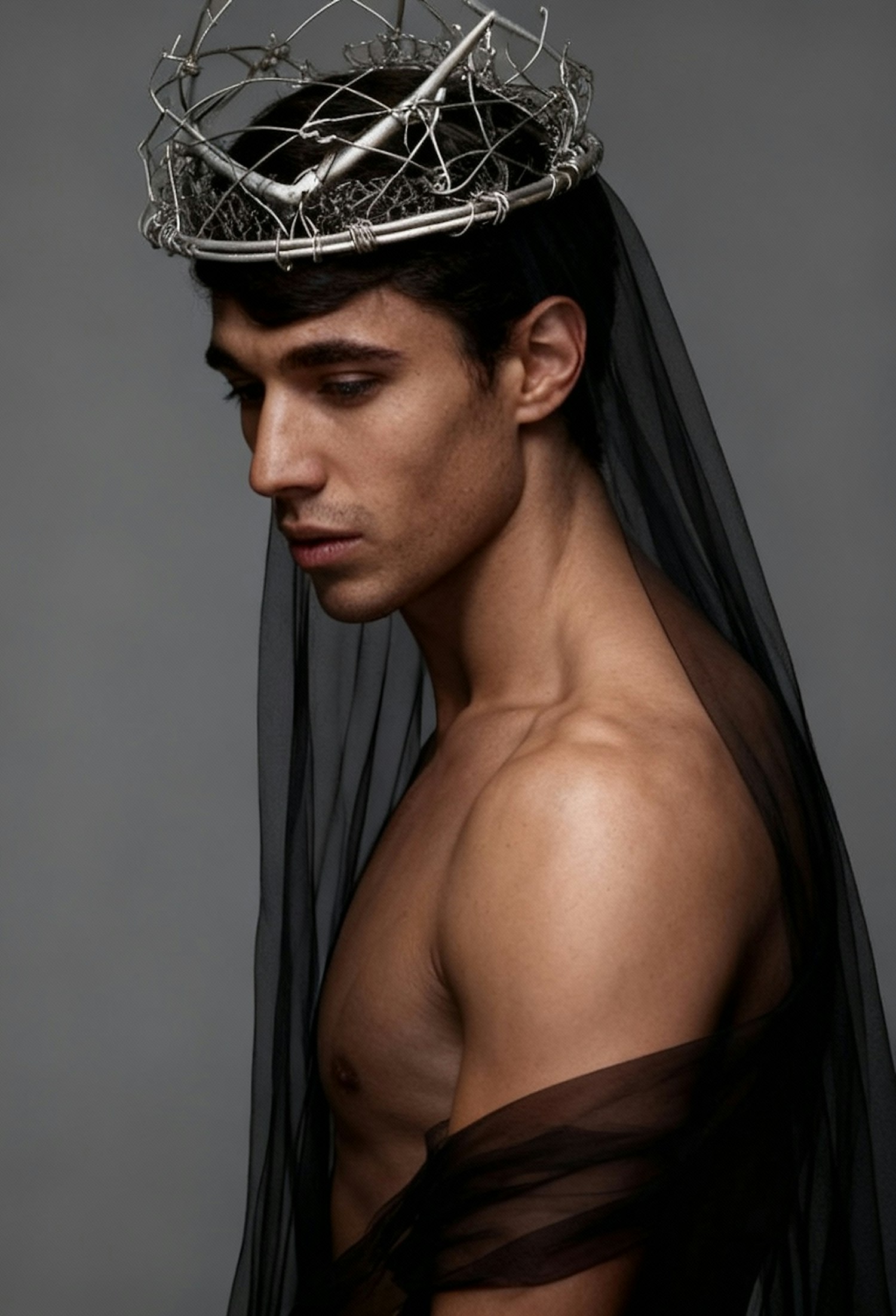 A striking portrait of a person wearing a thorn-like metallic crown and a black veil, set against a neutral background.