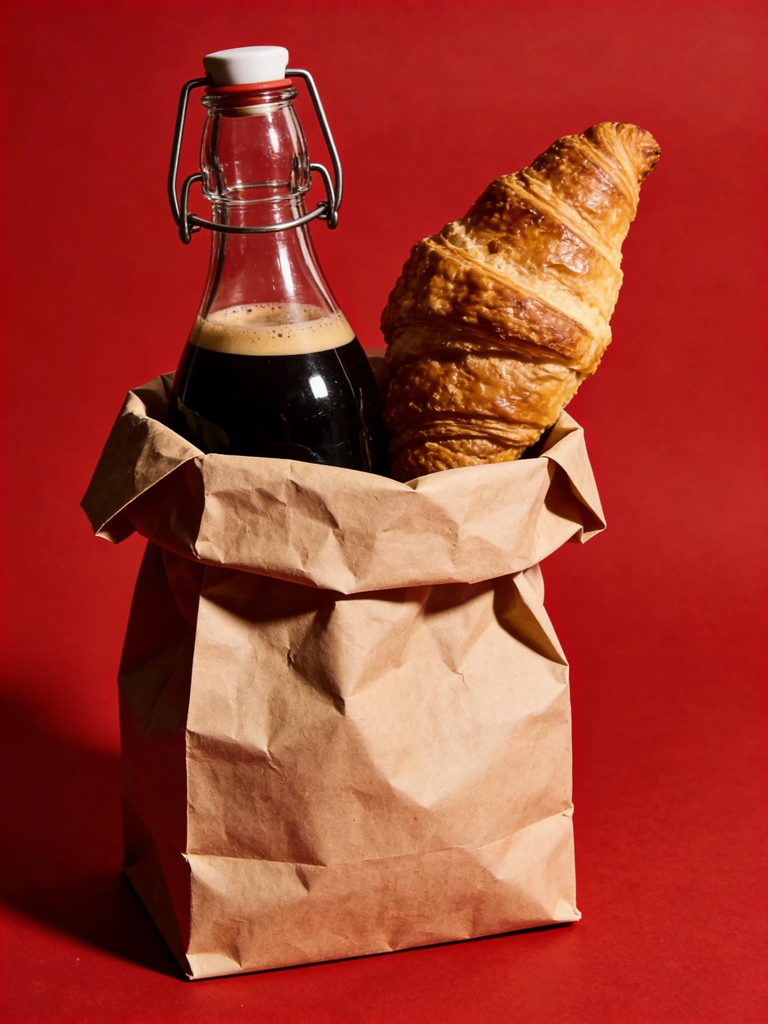 A brown paper bag with a croissant and a glass bottle of dark liquid against a red background, showcasing a simple and elegant composition.
