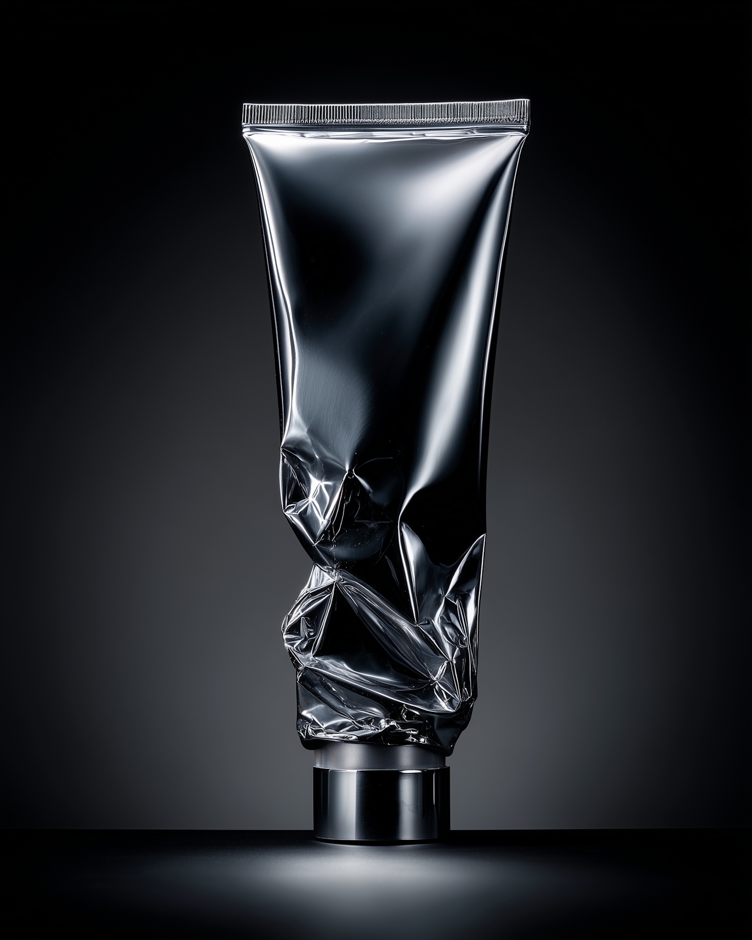 A crumpled metallic tube with a shiny cap, set against a dark background, showcasing its reflective surface and dramatic lighting.