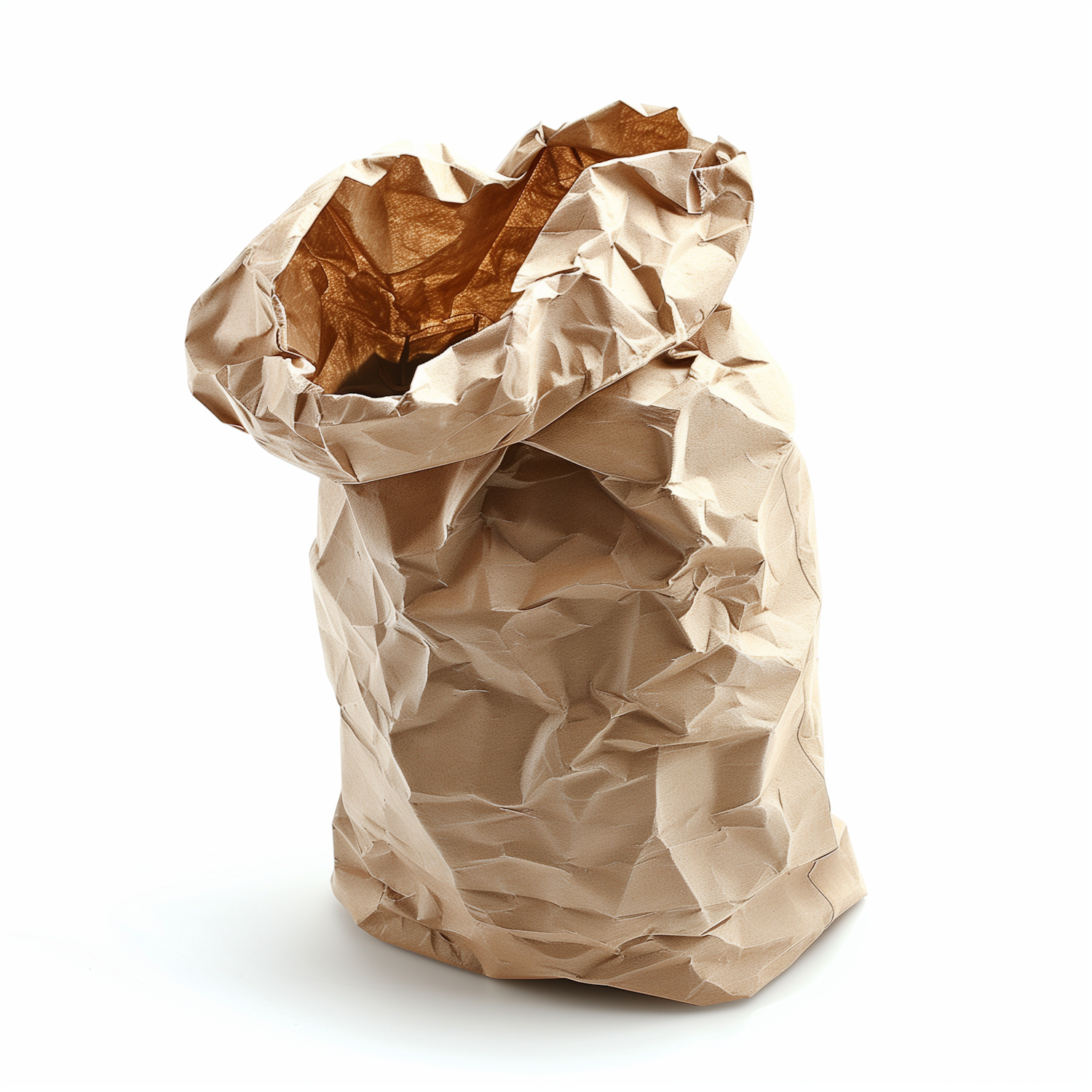 A crumpled brown paper bag with an open top, showcasing detailed creases and folds, set against a clean white background.