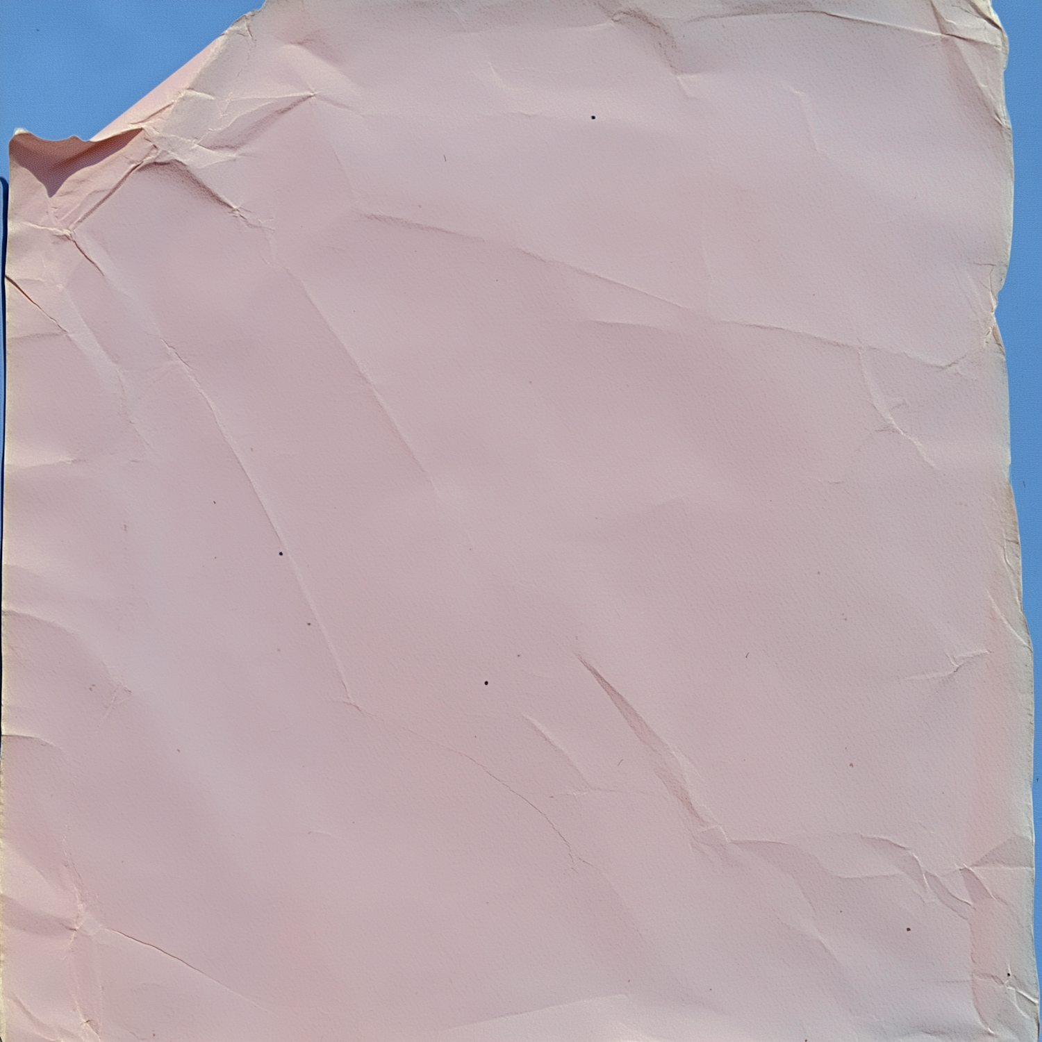 Crumpled light pink paper with creases and a torn corner, set against a bright blue background for a bold contrast.
