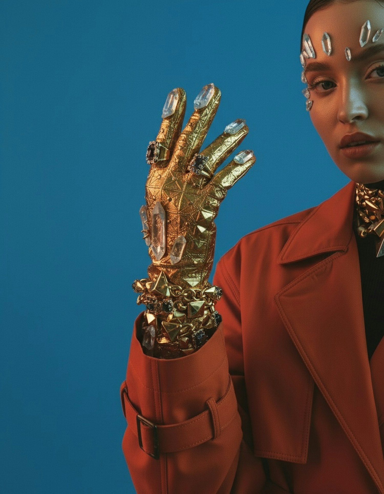 A bold fashion statement featuring a golden crystal-encrusted glove, orange coat, and avant-garde crystal accents on a blue backdrop.