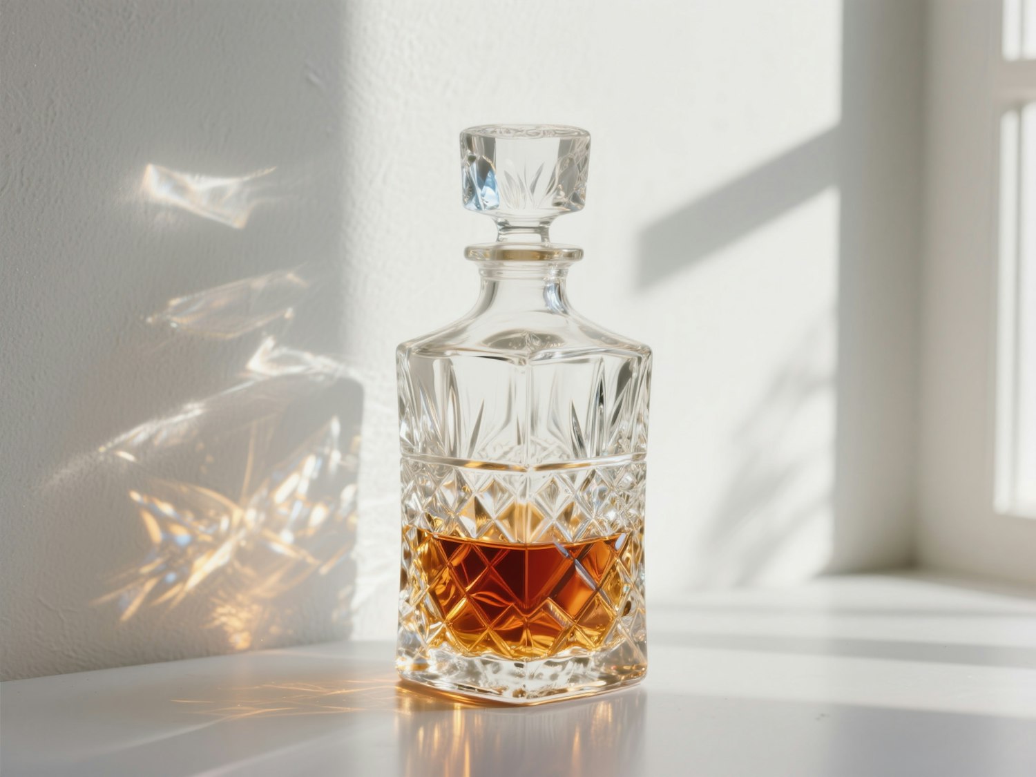 Elegant crystal decanter with amber liquid, sunlight casting intricate reflections on a white surface. Minimalist and luxurious vibe.