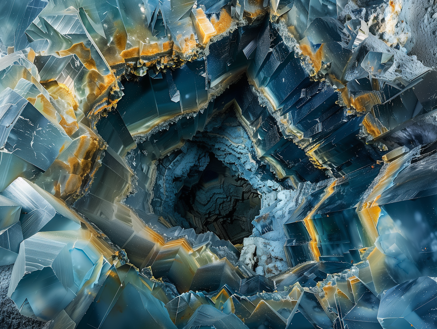 Abstract crystalline structure with blue and gold hues, featuring intricate geometric patterns and a sense of depth and complexity.
