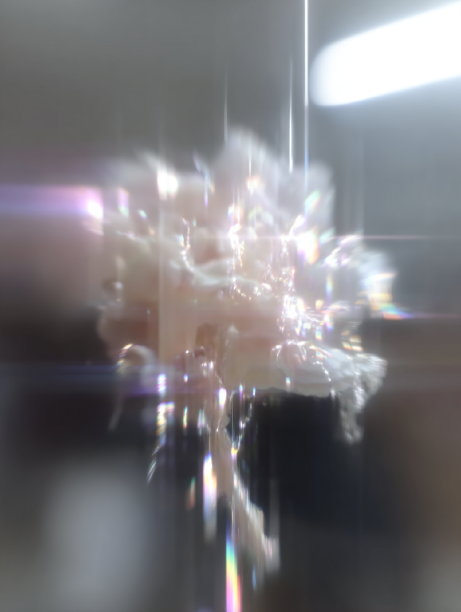 A close-up of a crystalline structure with refracted light creating a spectrum of colors, set against a blurred background.