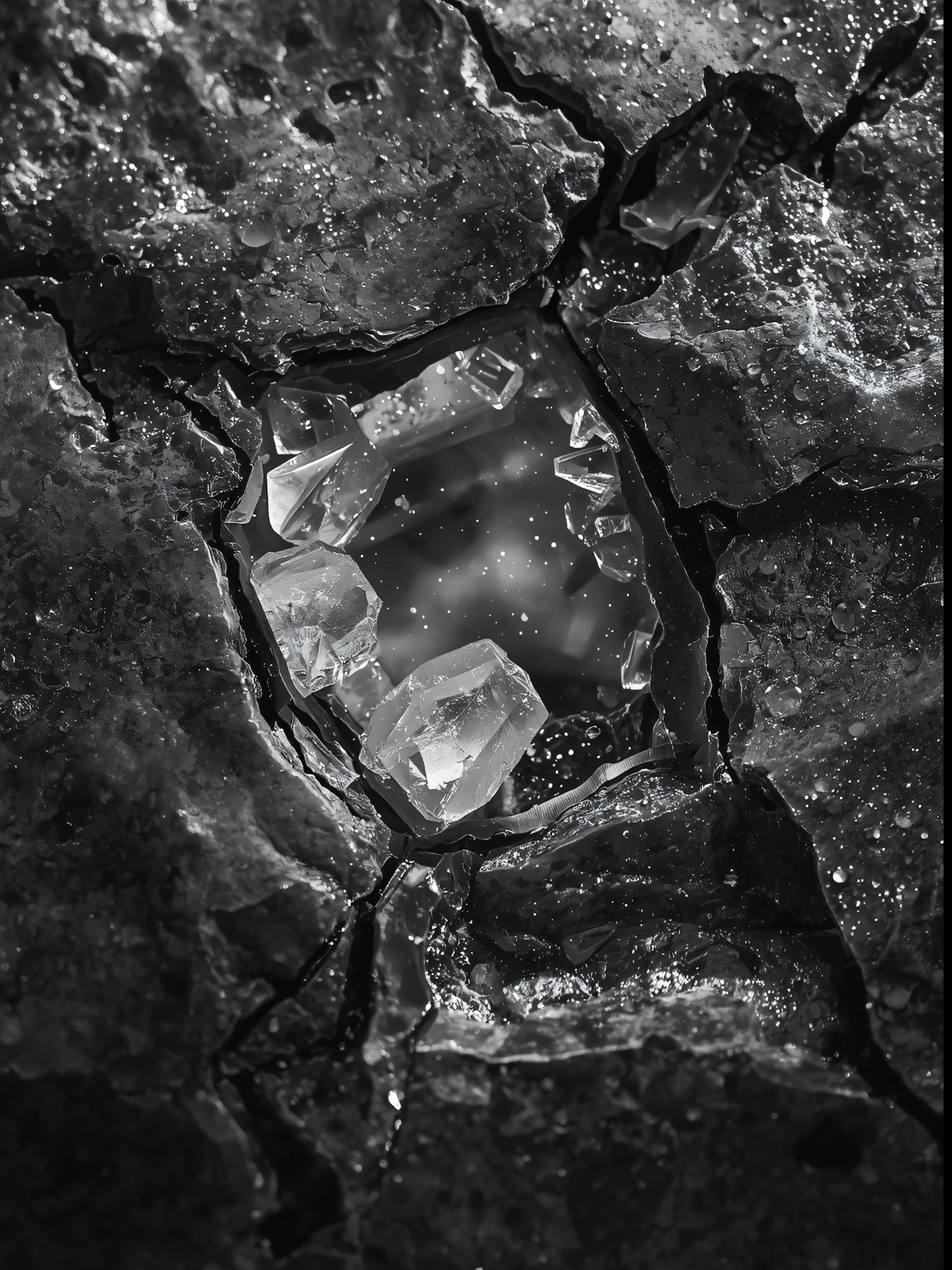 Close-up of a cracked dark surface revealing clear crystals beneath, with dramatic lighting emphasizing textures and reflections.