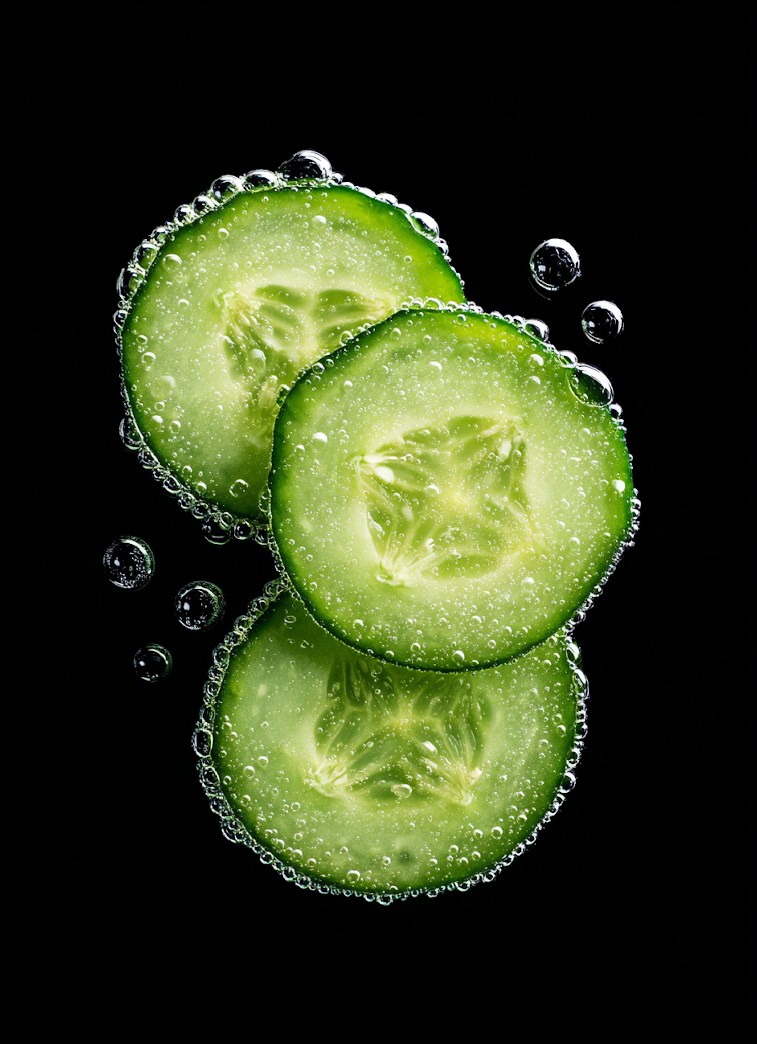 Close-up of two cucumber slices in sparkling water, with bubbles clinging to their edges, set against a black background.