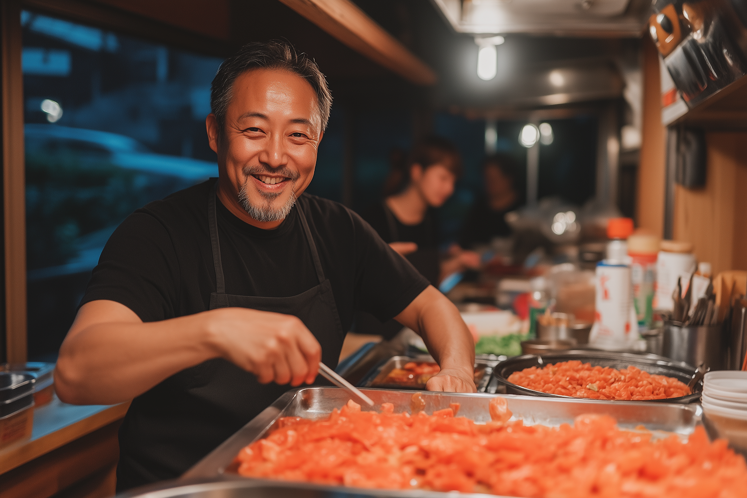 Smiling chef in a cozy kitchen preparing sliced red vegetables, creating a warm and inviting atmosphere.
