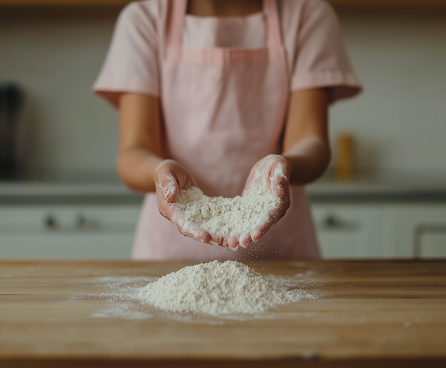 Hands holding flour over a wooden countertop in a kitchen, wearing a pink apron. Perfect for baking or cooking themes.