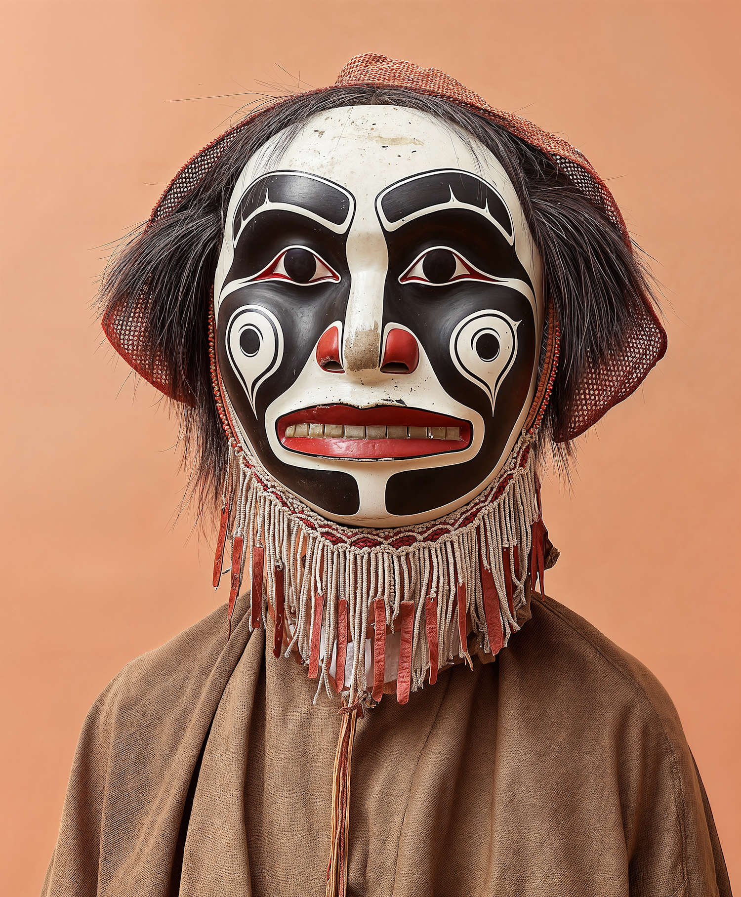Traditional mask with bold black, white, and red patterns, worn with a brown garment and netted headpiece. Warm beige background.
