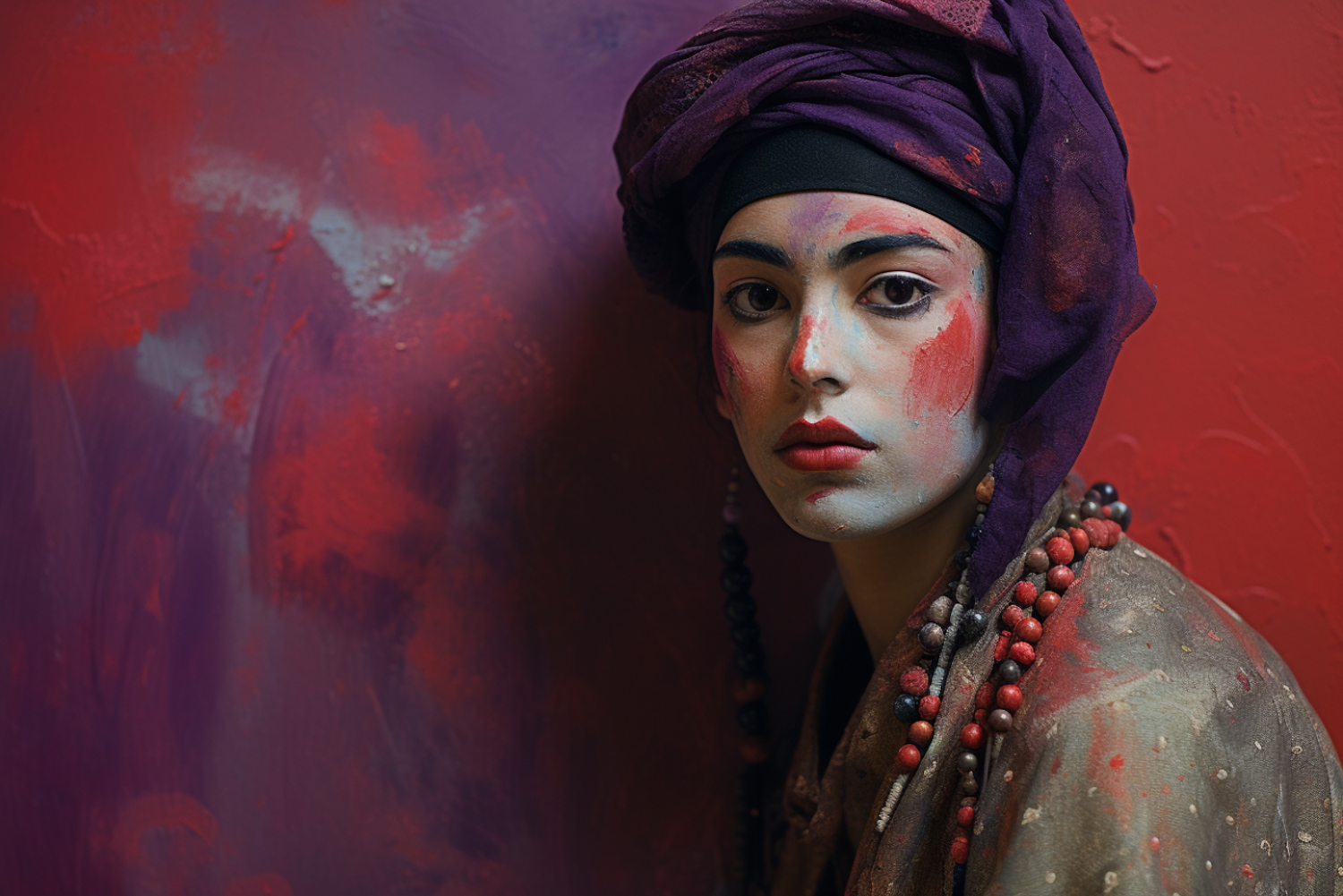 A person with artistic face paint and a purple headscarf stands against a vibrant red and purple background, adorned with beaded necklaces.