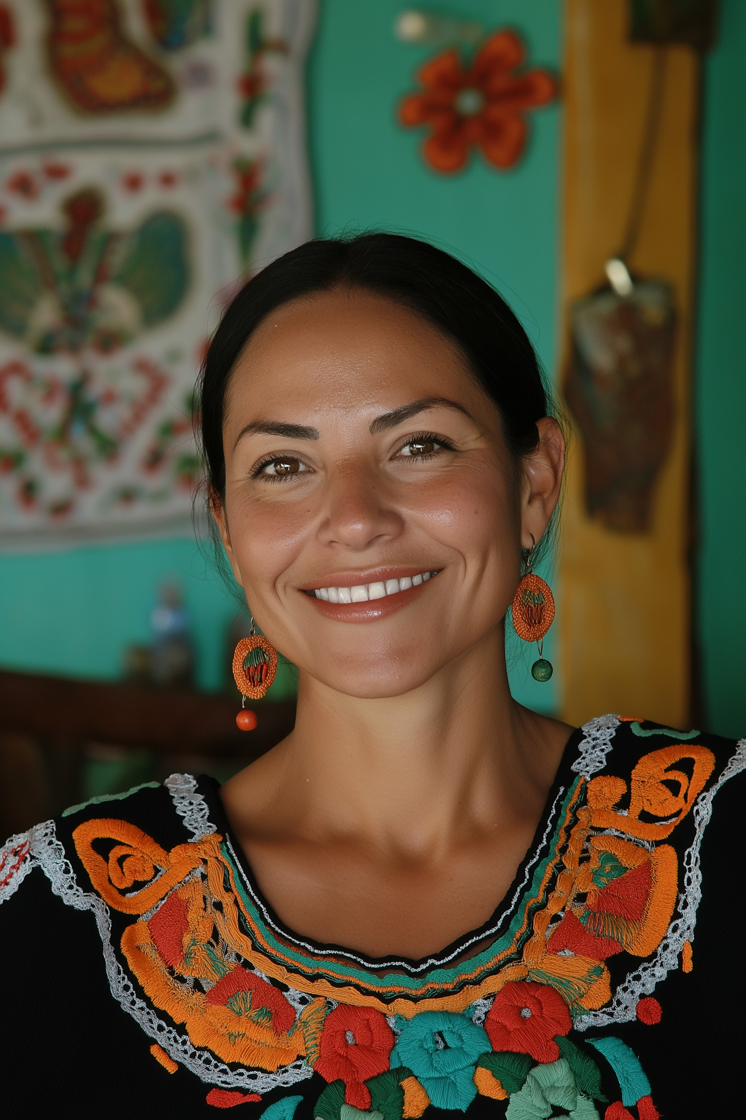 Smiling woman in colorful embroidered blouse and orange earrings, set against a teal background with floral and butterfly decor.