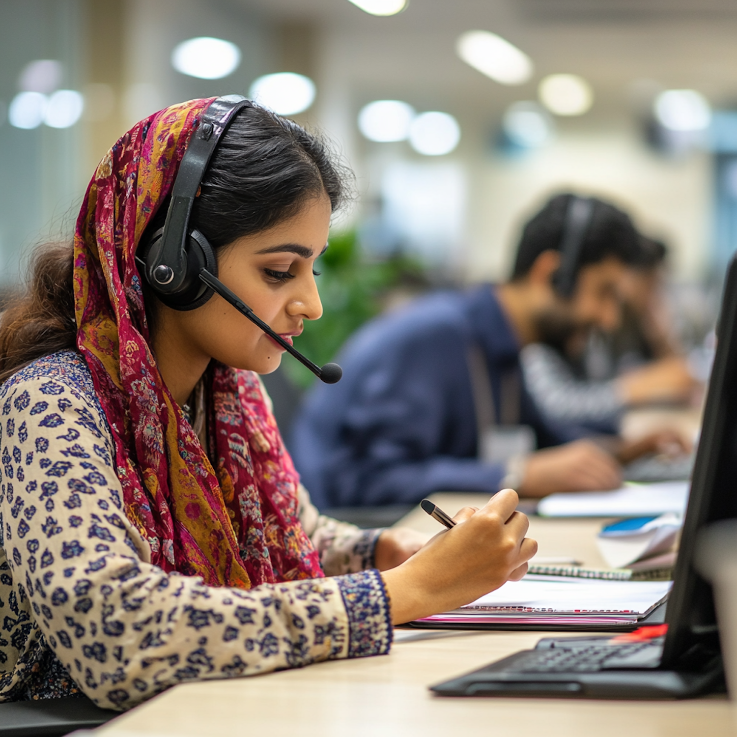 Focused call center employee in a vibrant headscarf working diligently at her desk, surrounded by colleagues in a modern office.
