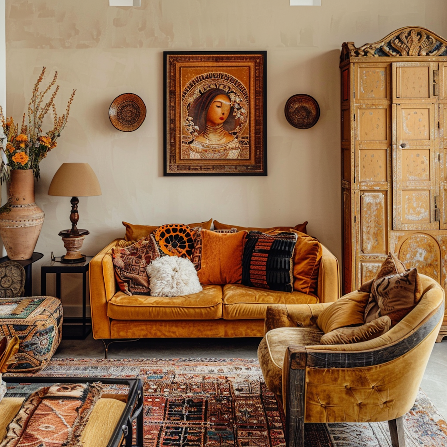 Warm living room with mustard sofa, rustic decor, and patterned rug. Cozy ambiance with earthy tones and textured pillows.