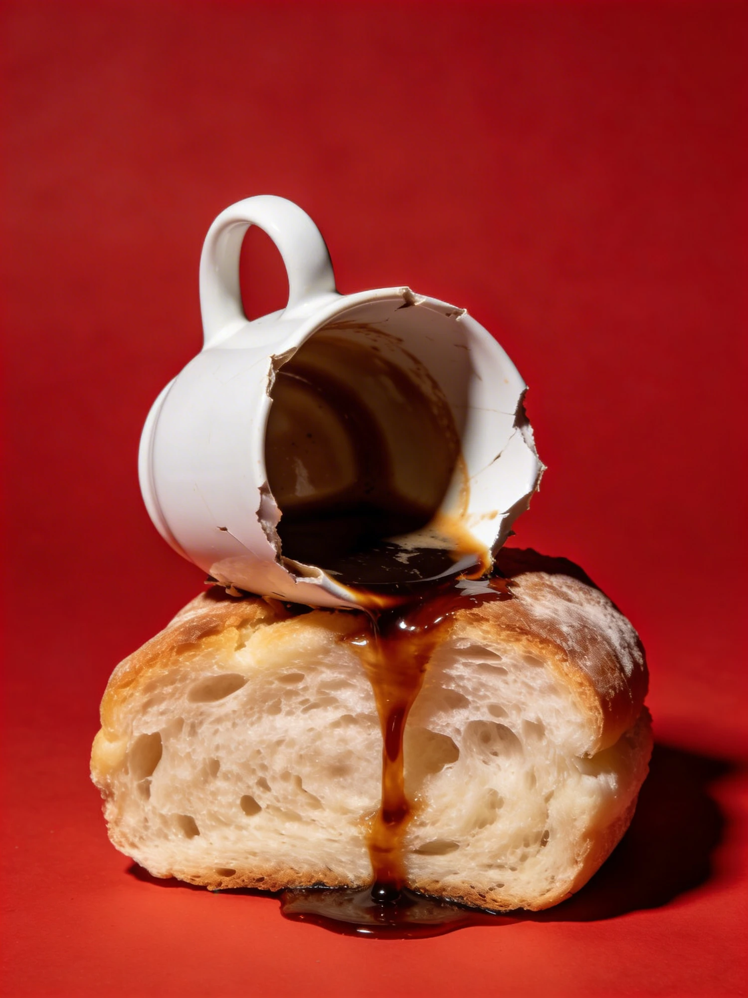 A broken white cup spills dark liquid onto a crusty bread slice against a vibrant red background, creating a striking visual contrast.