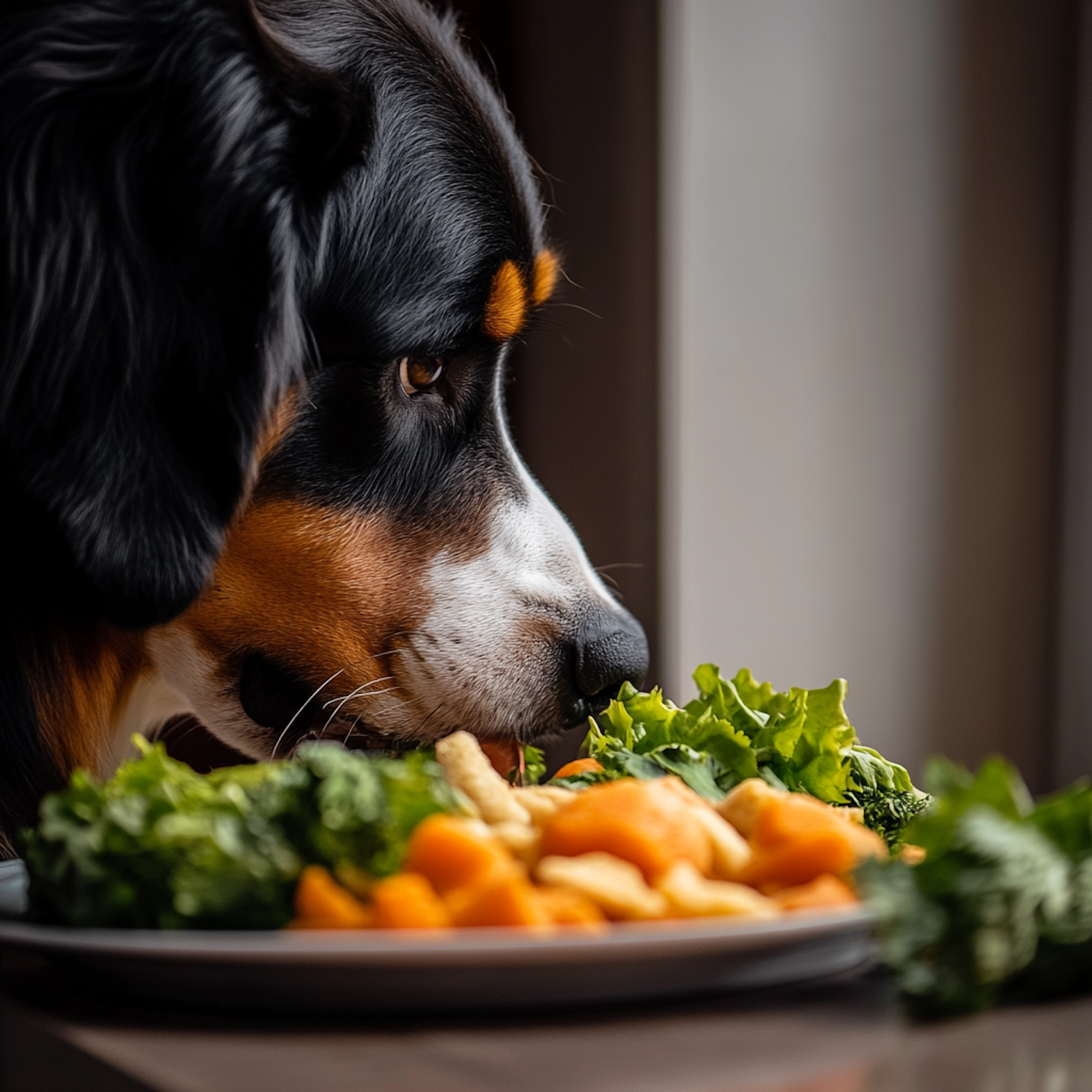 A curious dog sniffs a plate of fresh vegetables, including lettuce and orange slices, in a warmly lit setting.