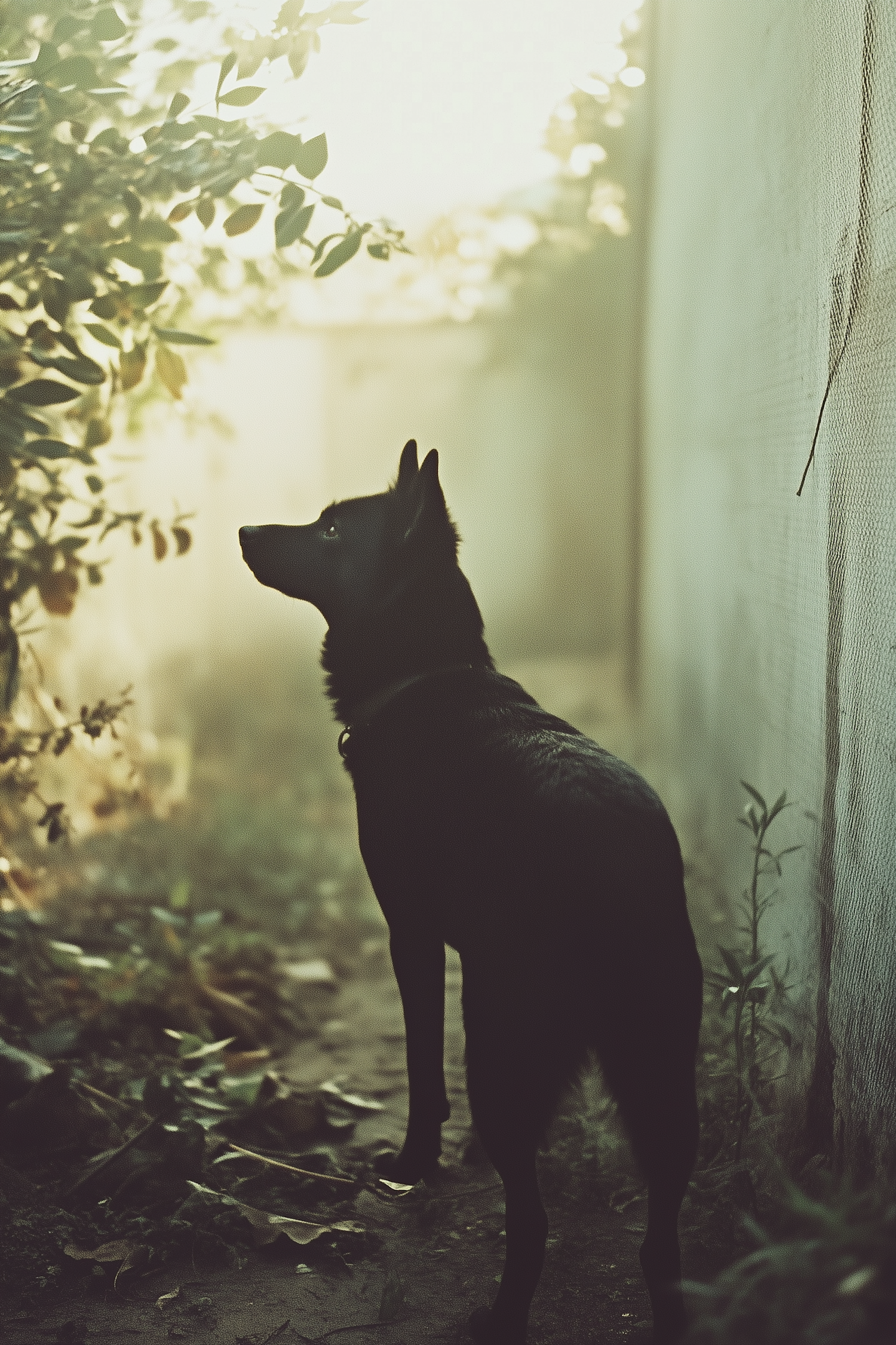 A black dog stands alert in a sunlit alley, surrounded by leaves and shadows, creating a serene and focused atmosphere.