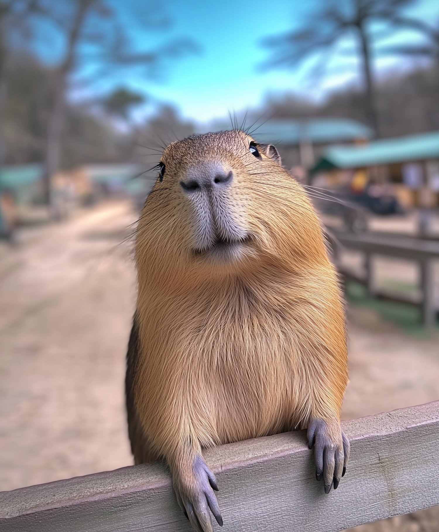 Adorable close-up of a curious capybara leaning on a wooden fence in an outdoor park with a clear blue sky in the background.