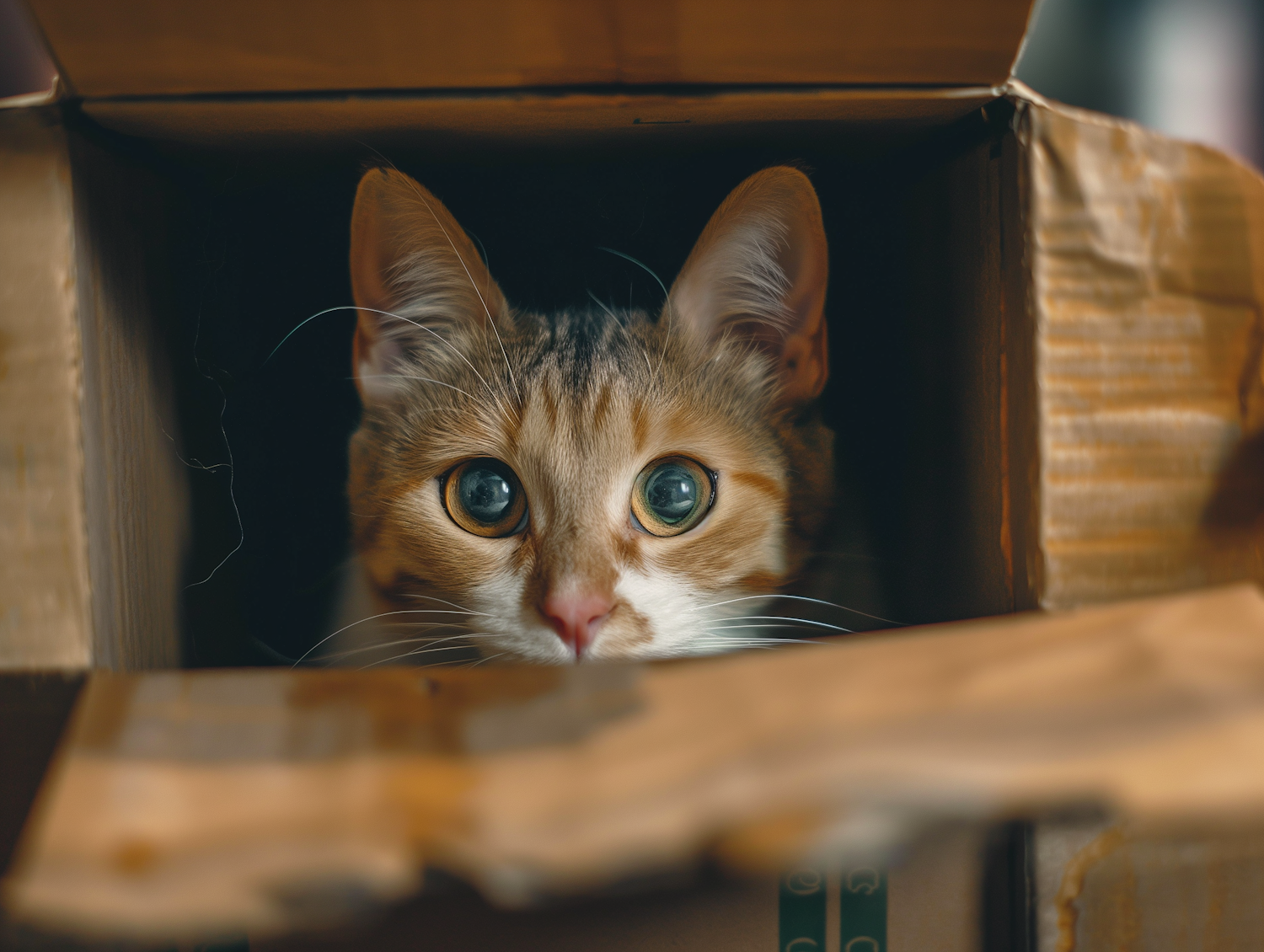 Adorable cat peeking out of a cardboard box with wide eyes, showcasing curiosity and playfulness.