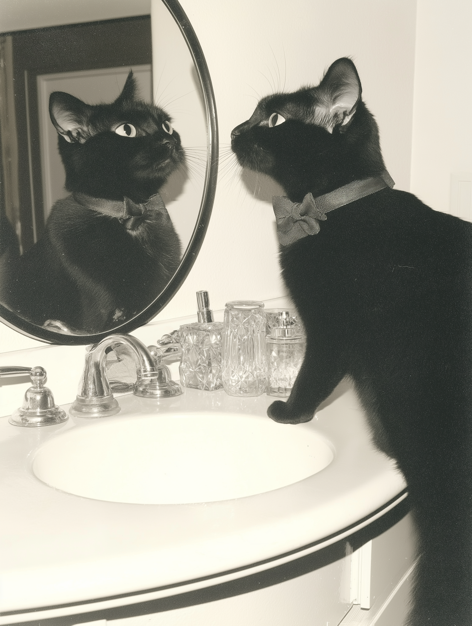 A black cat with a bow tie looks at its reflection in a bathroom mirror, surrounded by crystal containers and a silver faucet.