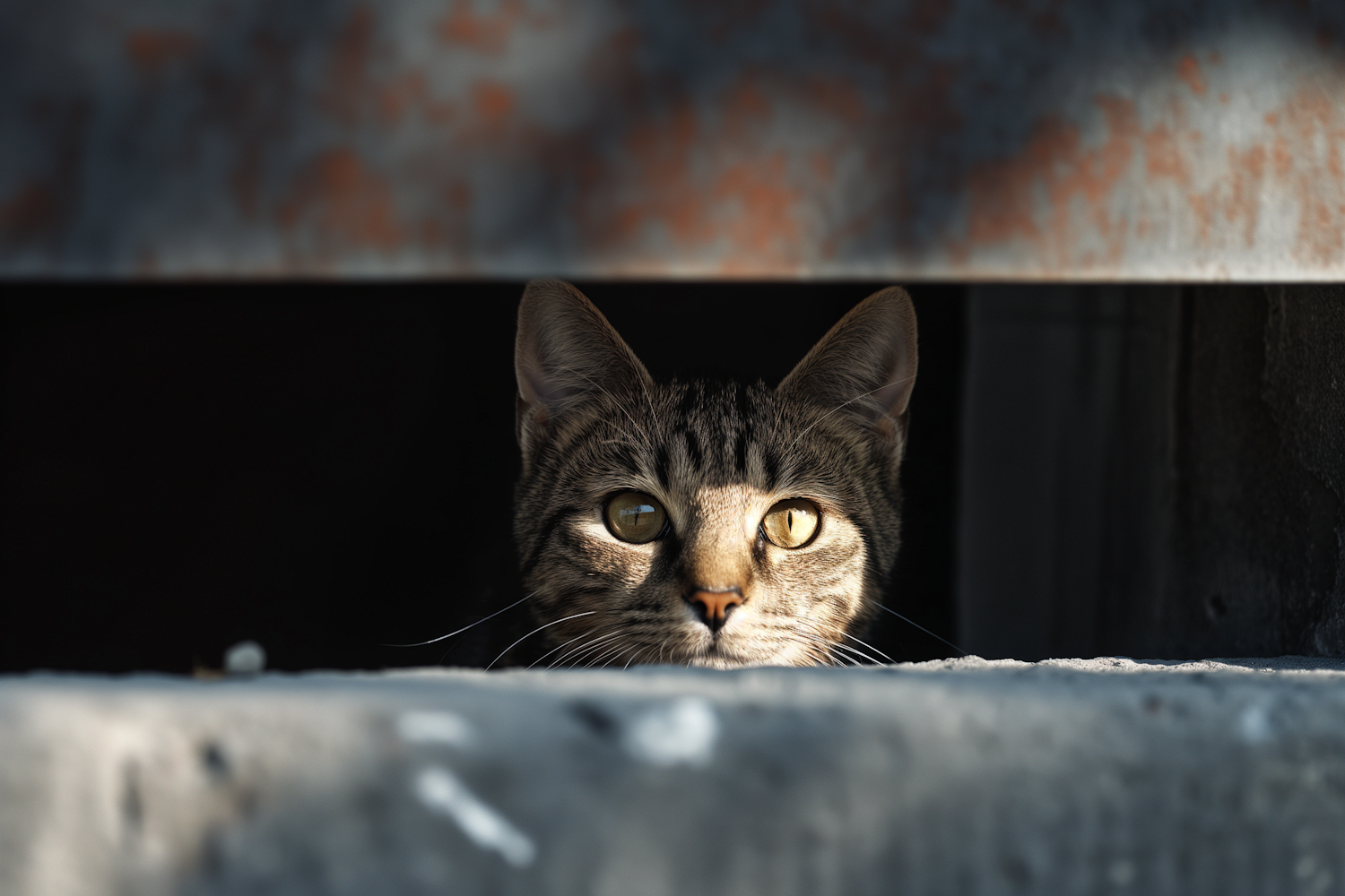 A curious tabby cat with golden eyes peers through a gap, its face illuminated by sunlight, creating a mysterious and intriguing scene.