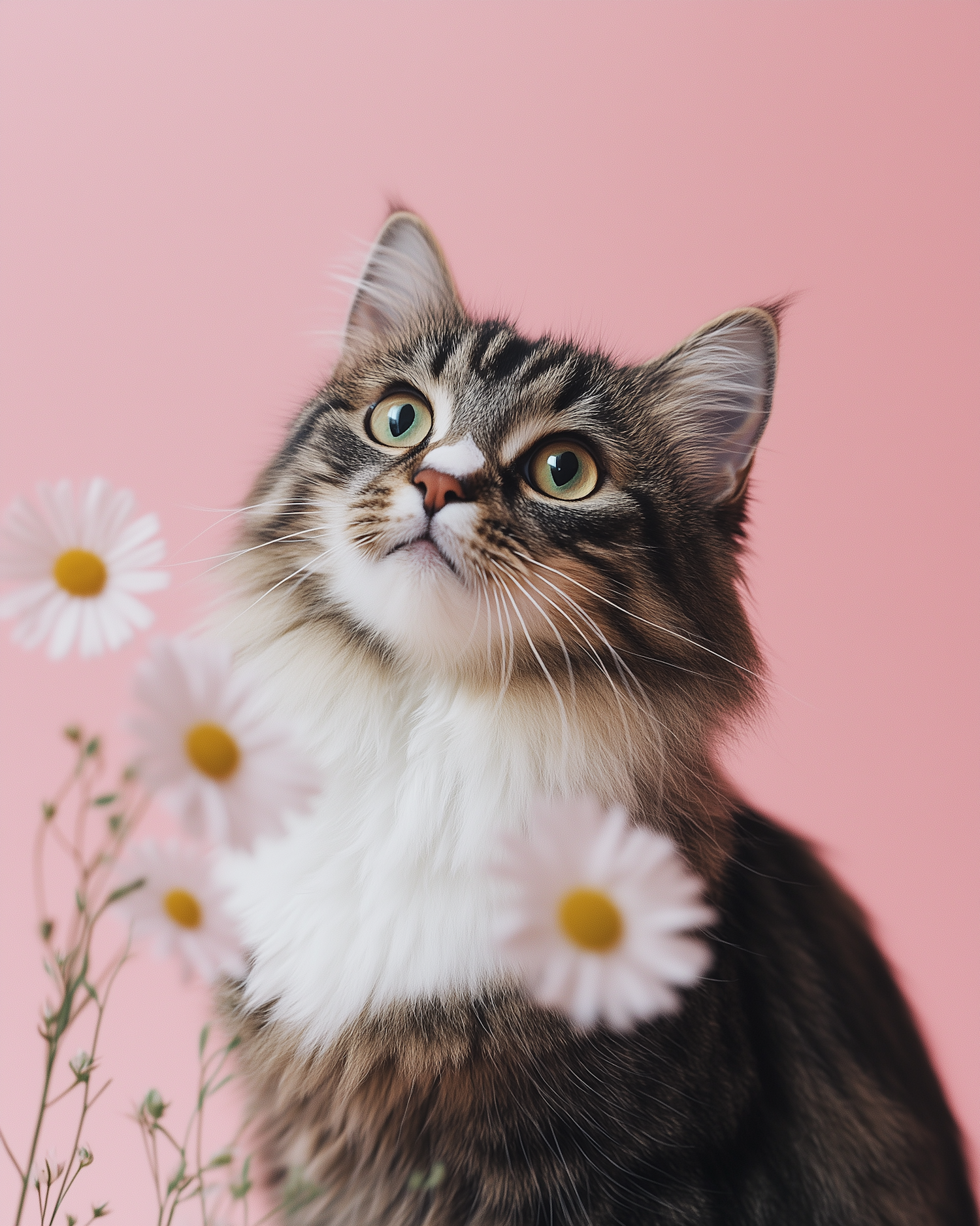 Fluffy tabby cat with green eyes and daisies on a pink background, creating a whimsical and warm atmosphere.