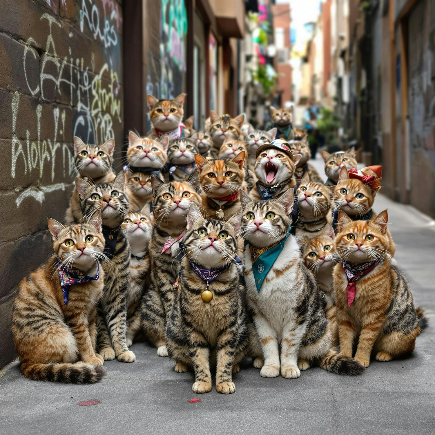 A lively group of cats with colorful bandanas gather in a graffiti-lined alley, all looking upwards with curious expressions.