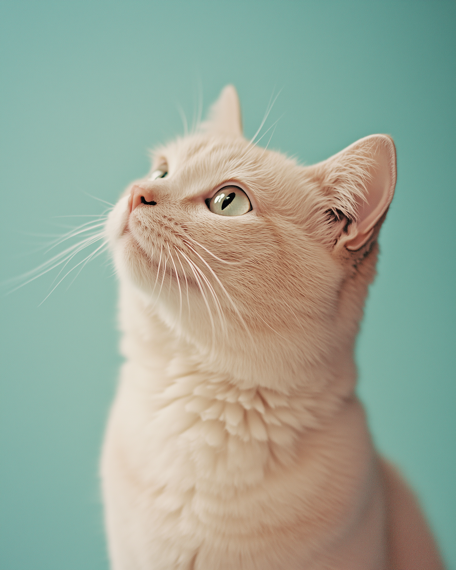 Cream-colored cat with green eyes gazes upward against a teal background, showcasing its fluffy fur and curious expression.