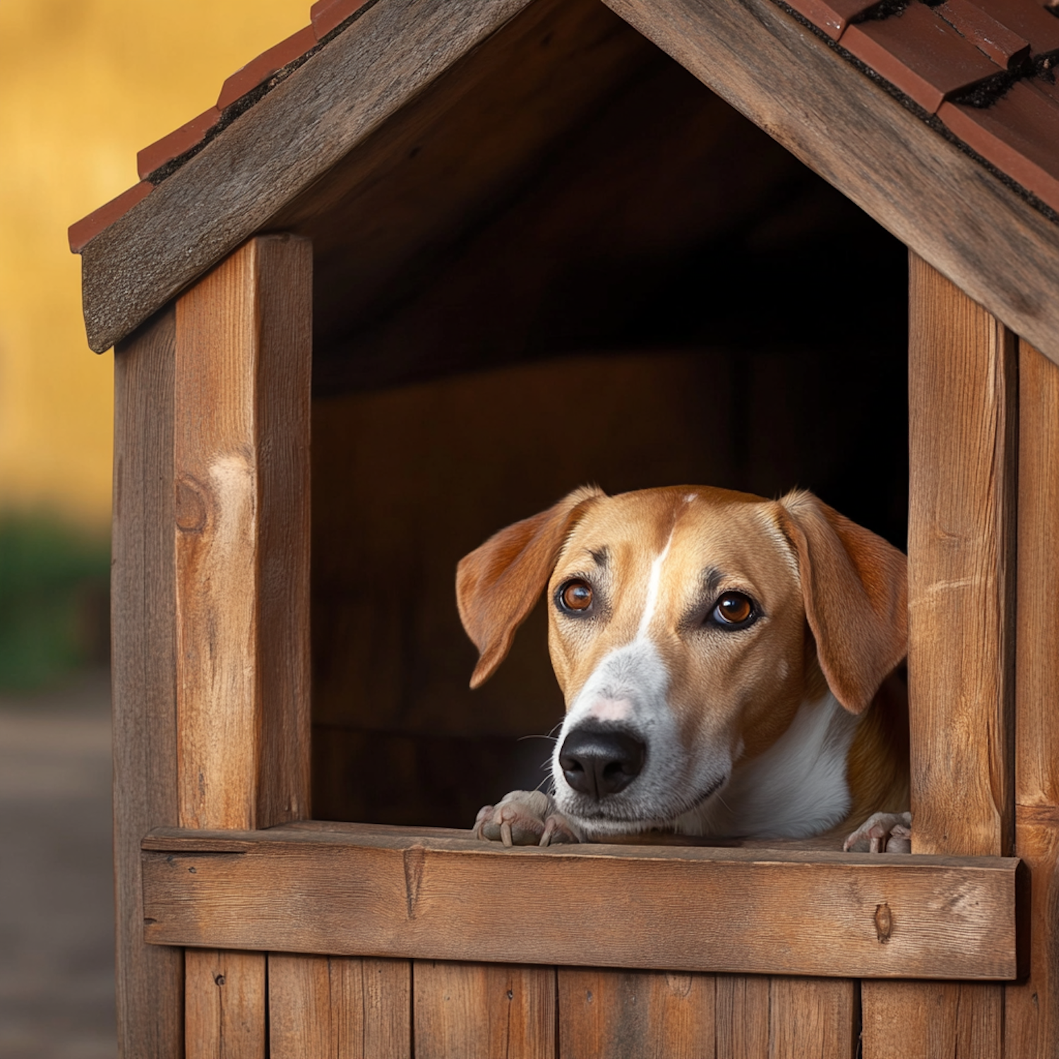 A brown and white dog peeks out from a rustic wooden doghouse, creating a cozy and inviting scene.