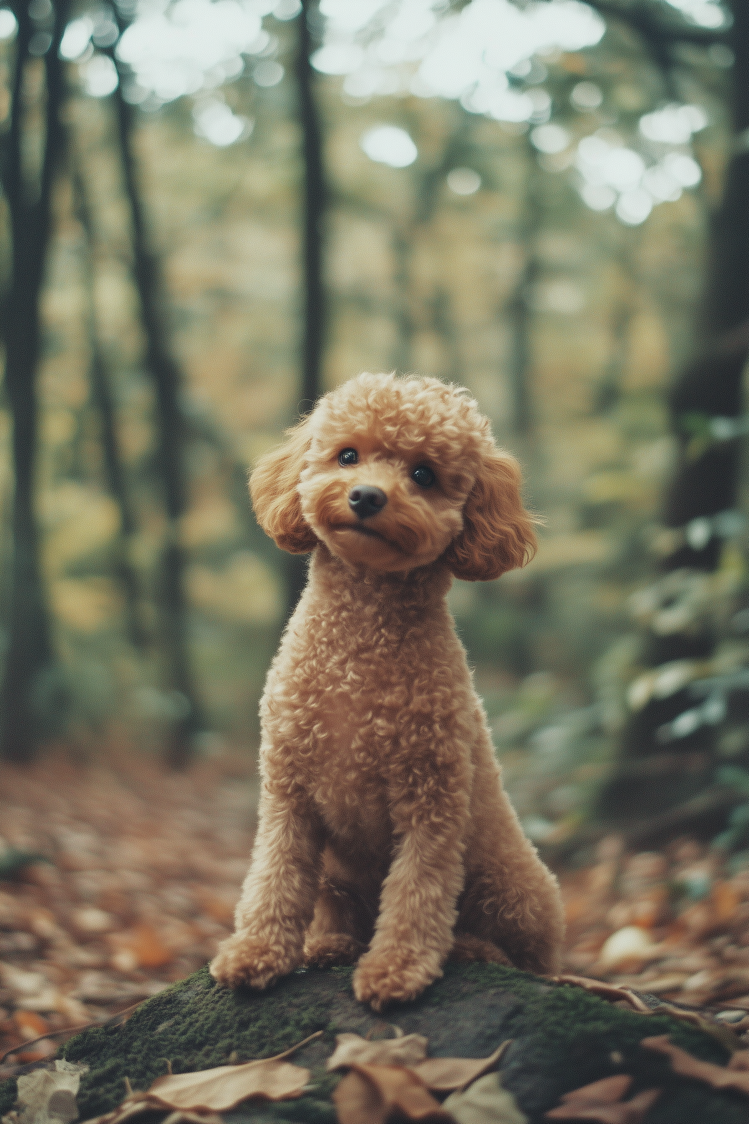 Golden-brown curly-haired dog sits on a mossy rock in a serene autumn forest, surrounded by blurred trees and fallen leaves.