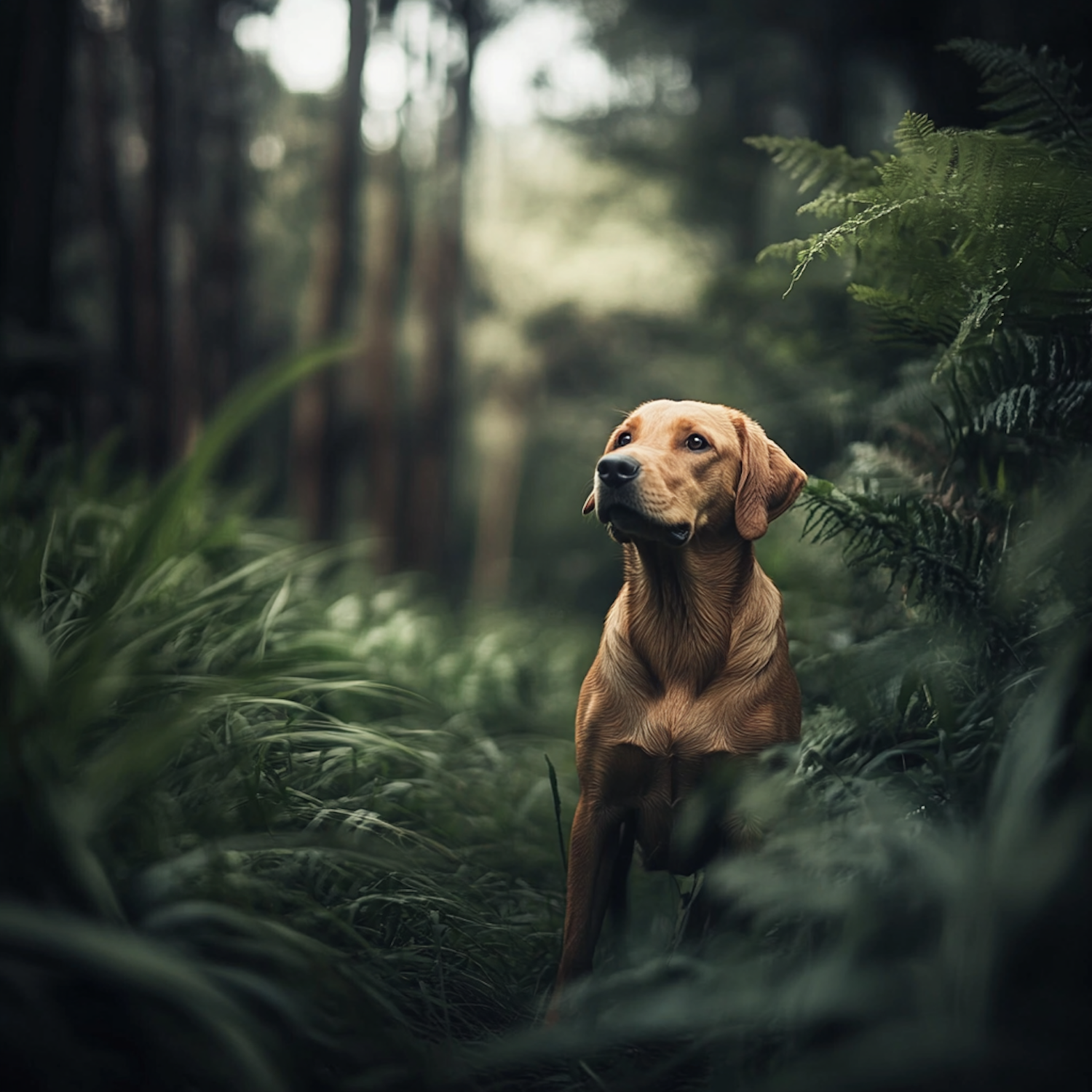 Golden Labrador retriever in a lush forest, surrounded by vibrant green foliage and soft natural lighting.