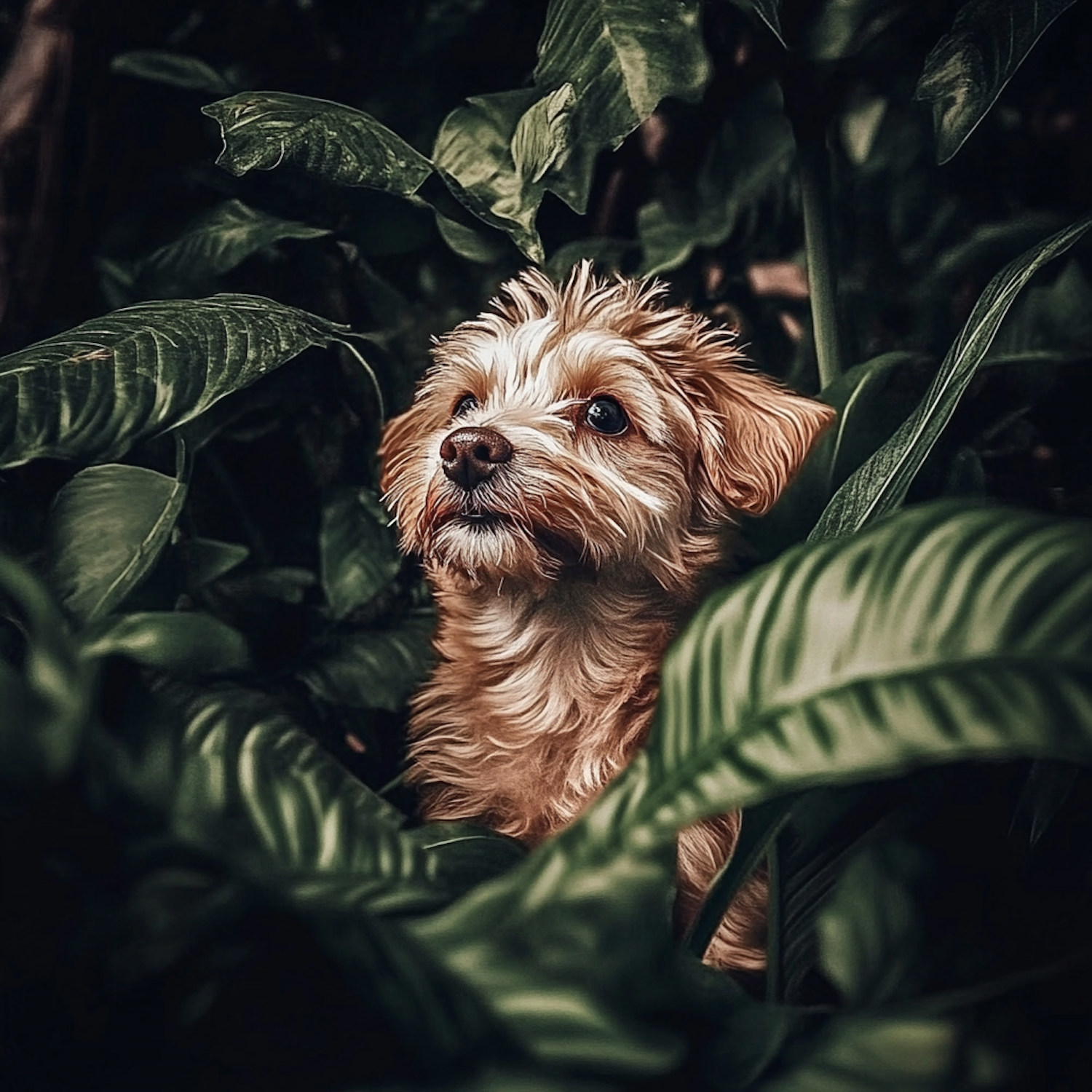 Adorable fluffy dog with light brown fur peeks through lush green leaves, creating a vibrant and harmonious nature scene.