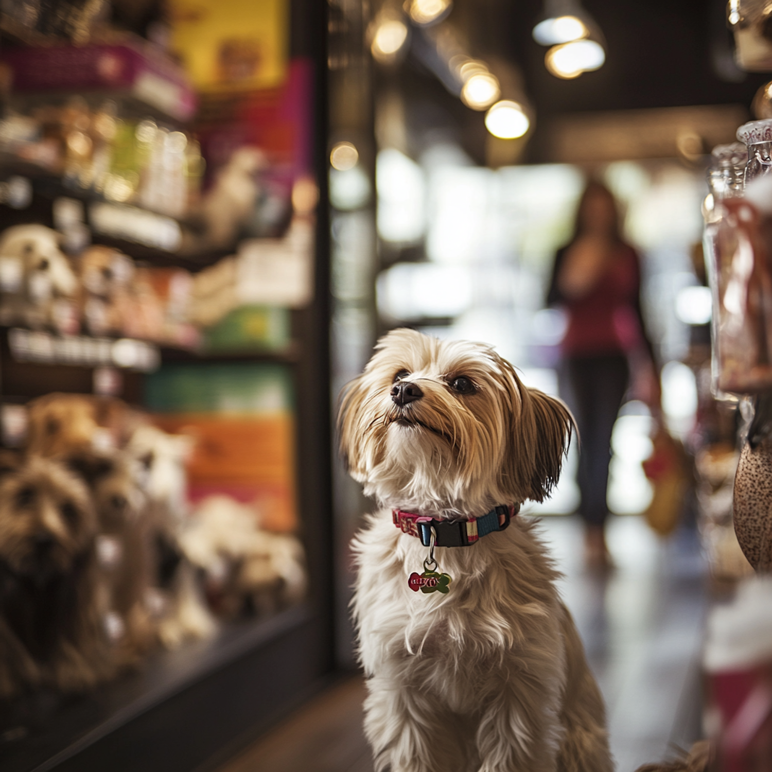Adorable fluffy dog in a pet store, wearing a colorful collar. Shelves filled with pet products in the background.