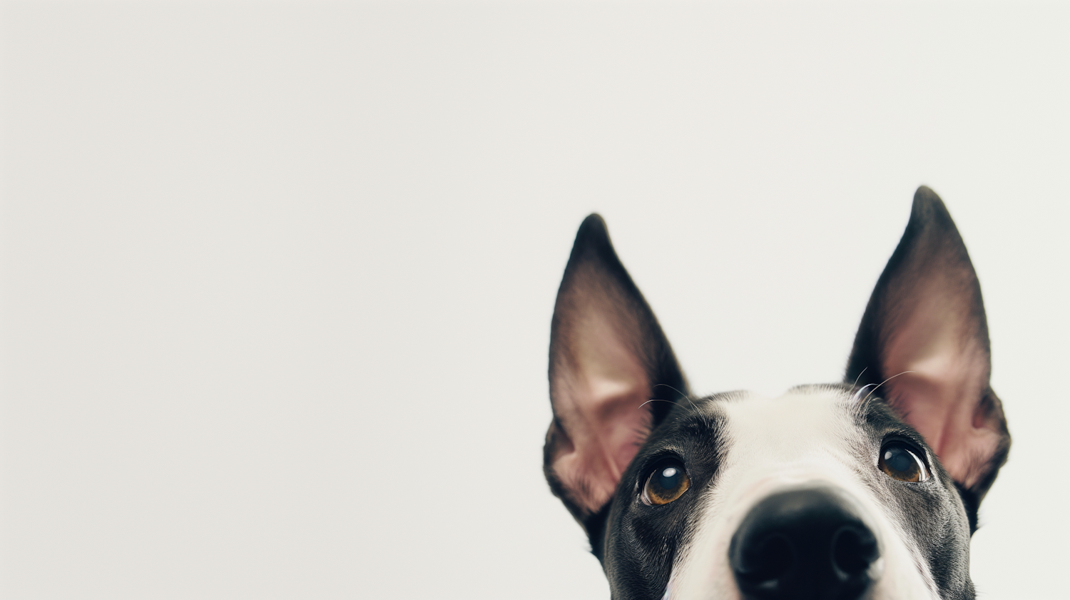 Close-up of a curious black and white dog with perked ears against a plain background, highlighting its expressive eyes.