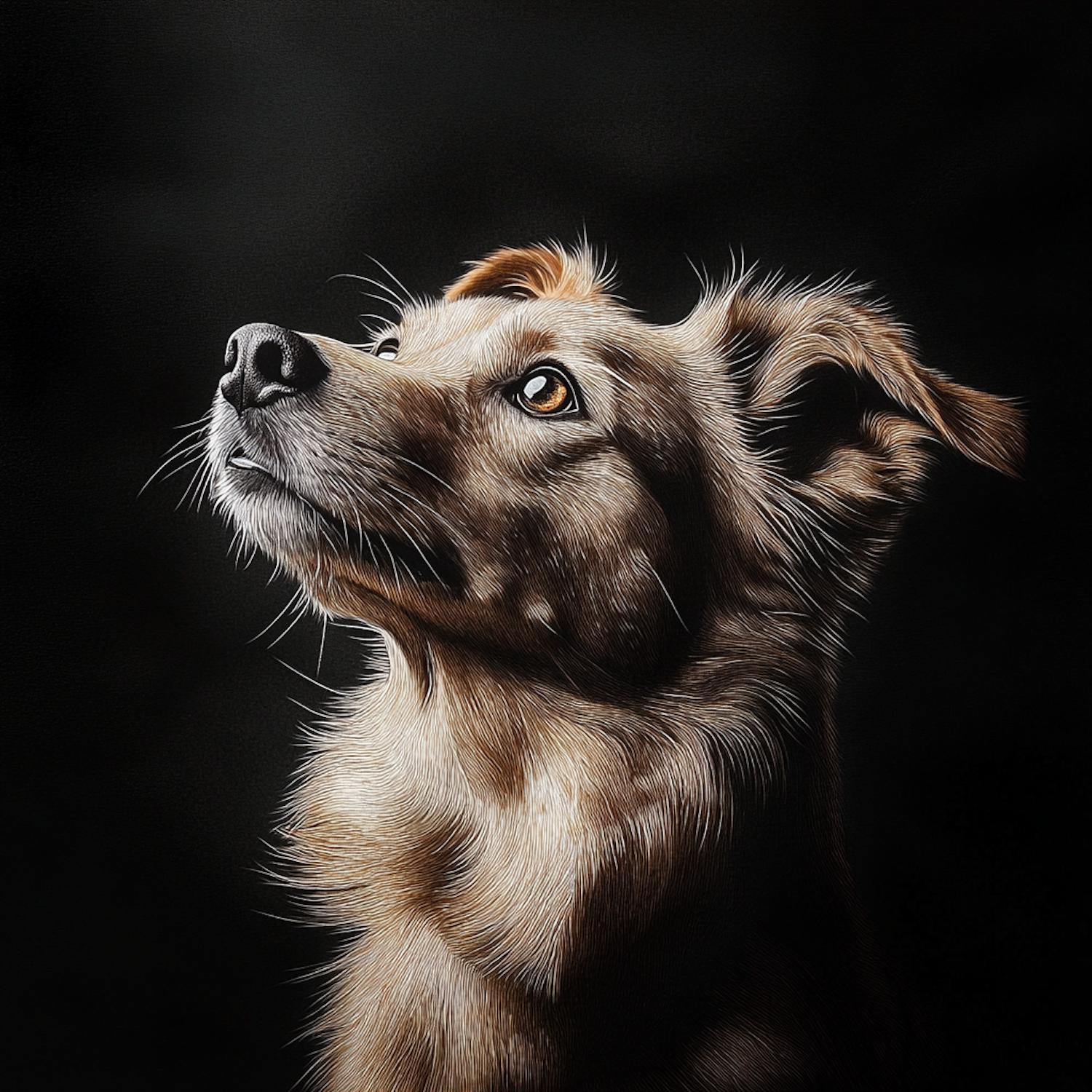 Close-up of a golden-brown dog gazing upward with a thoughtful expression, set against a dramatic dark background.