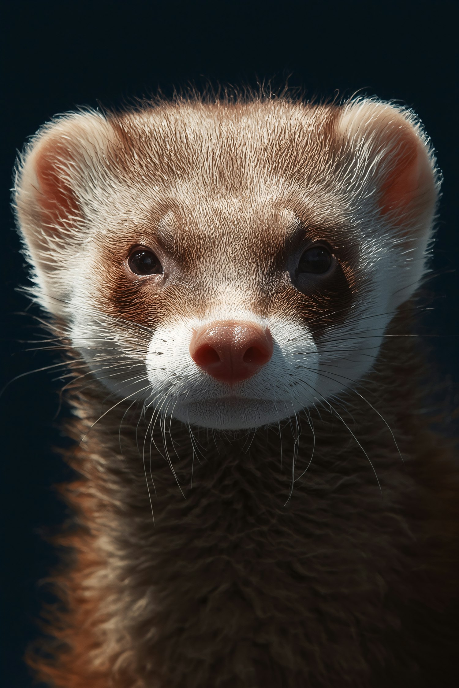 Close-up of a ferret with a dark background, highlighting its expressive eyes, pink nose, and soft brown and white fur.