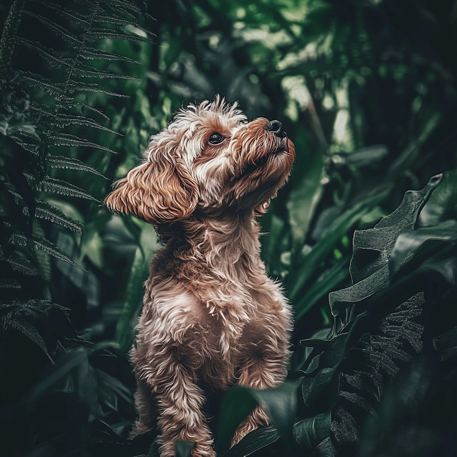 Fluffy dog with curly fur sits among lush green foliage, looking upward with an inquisitive expression.
