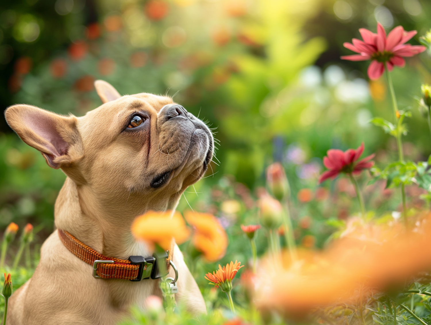 Adorable French Bulldog in a colorful garden, surrounded by vibrant flowers and sunlight, looking curiously upward.