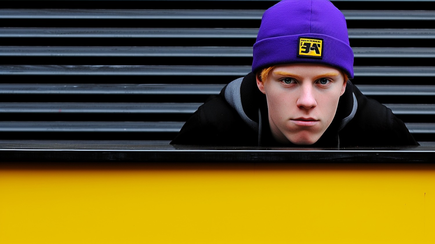 Young man in a purple beanie and black jacket against a striped metal background with a bold yellow stripe.