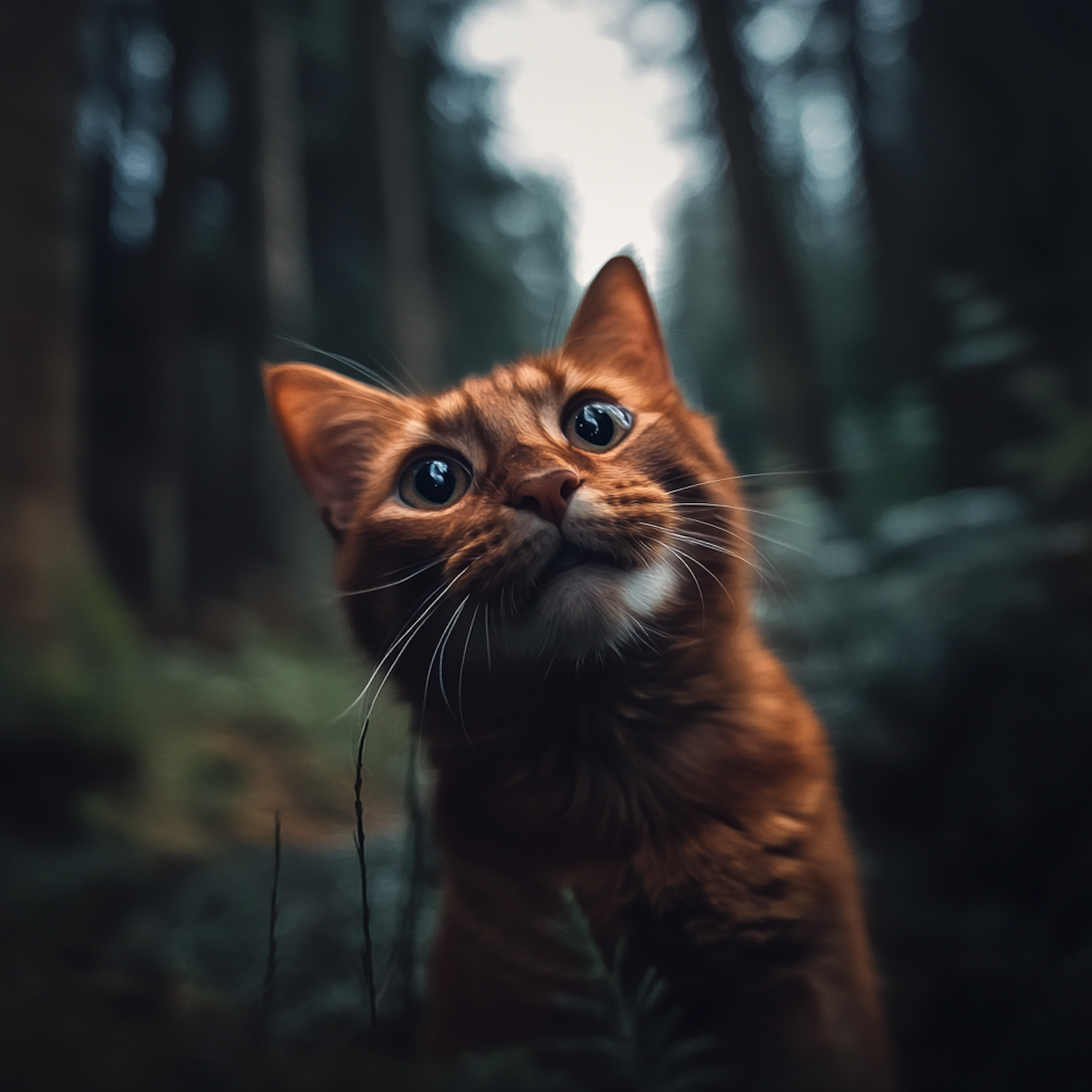 Curious ginger cat with wide eyes in a mystical forest setting, surrounded by blurred trees and lush greenery.