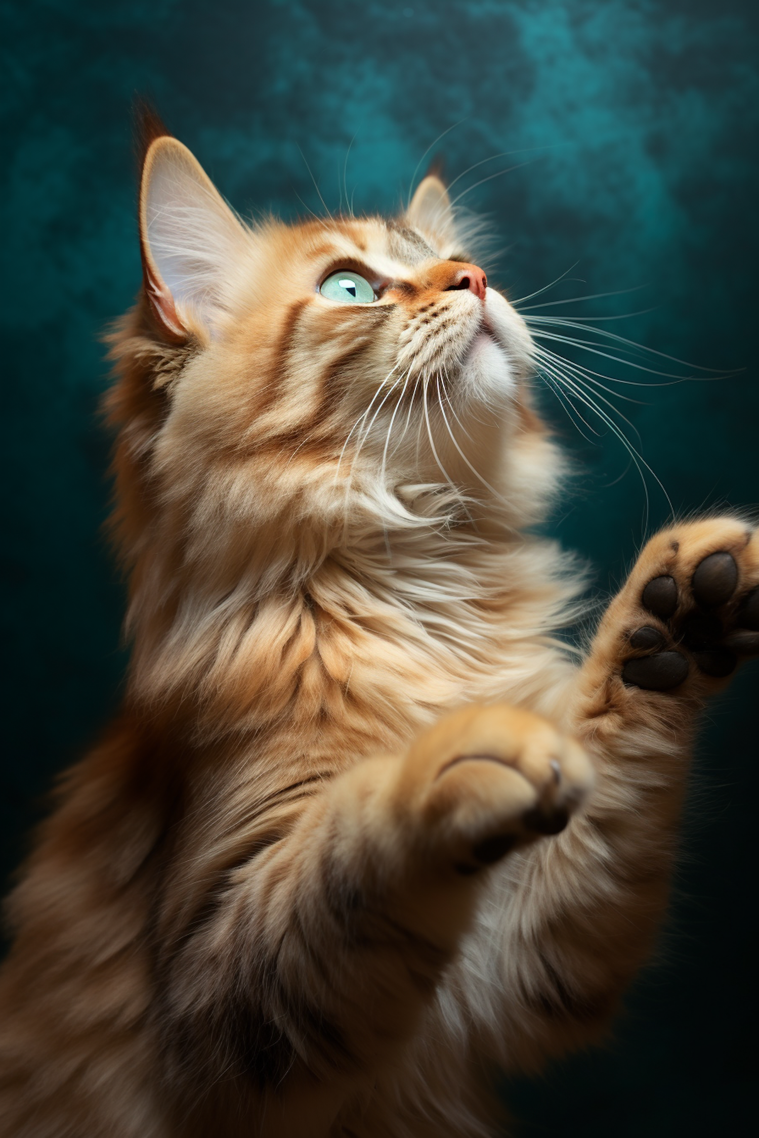 Fluffy orange tabby cat with blue eyes gazes upward against a teal background, showcasing its thick fur and curious expression.