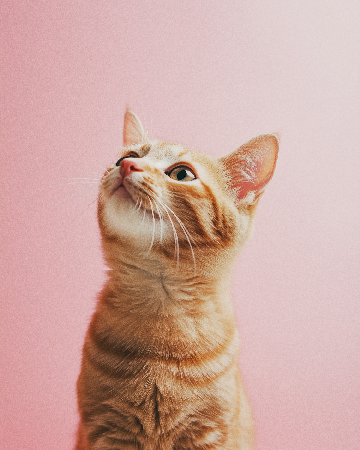 Adorable orange tabby cat with greenish-yellow eyes gazing upward against a pastel pink background. Perfect for pet lovers.