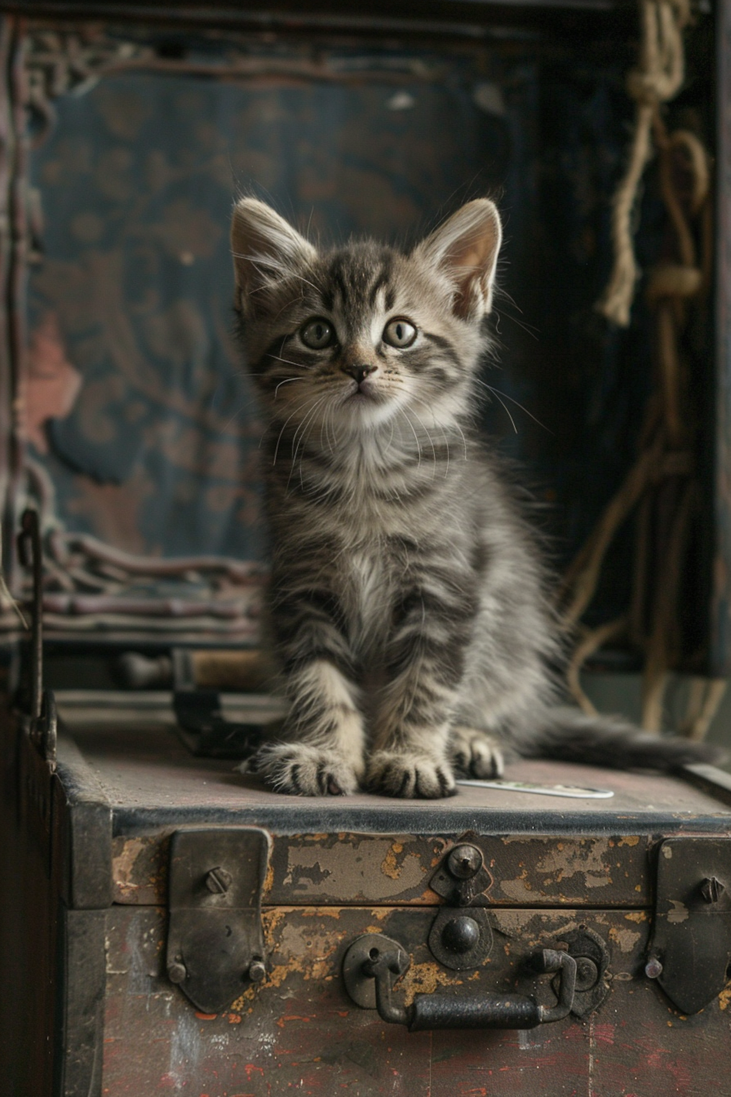 Curious Gray Tabby Kitten on Antique Trunk