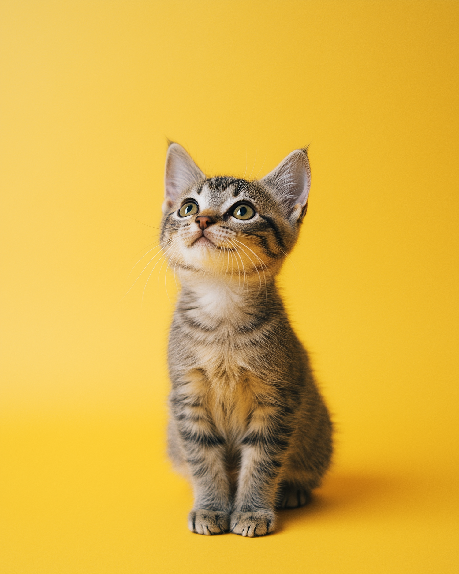 Adorable tabby kitten with green eyes sits against a vibrant yellow background, showcasing its cute expression and striped fur.