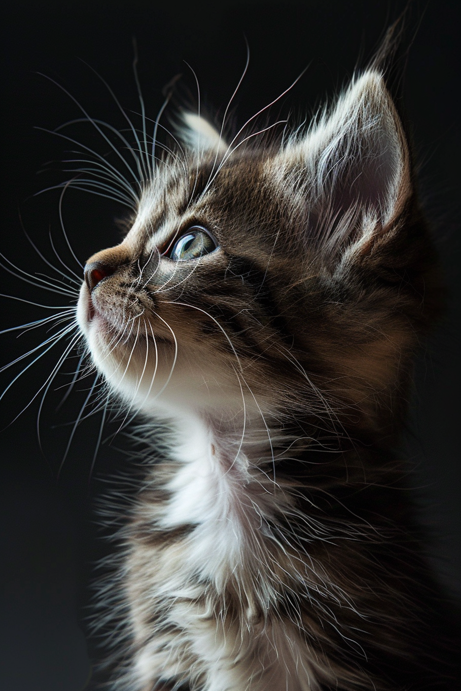Close-up of a fluffy kitten with striped fur and bright eyes, set against a dark background, creating a serene and contemplative mood.