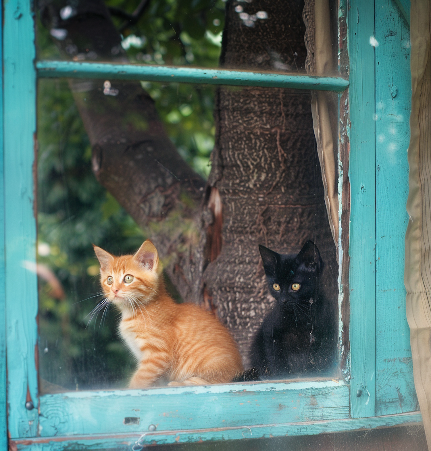 Two kittens, one ginger and one black, sit on a rustic turquoise windowsill, gazing outside with curious expressions.
