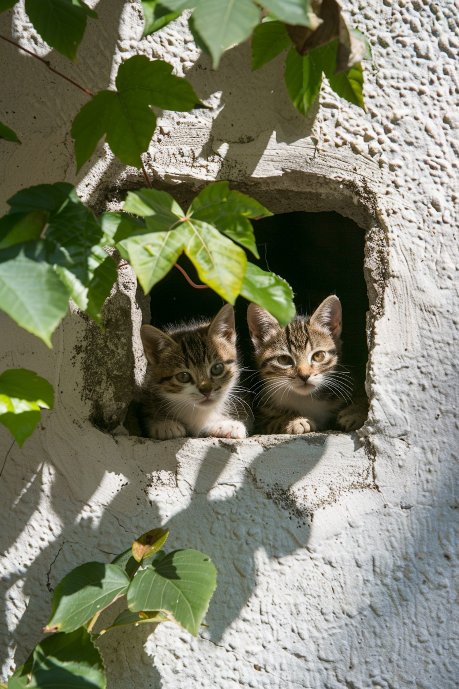 Two curious kittens peek out from a wall opening, surrounded by green leaves and sunlight, creating a charming and serene scene.