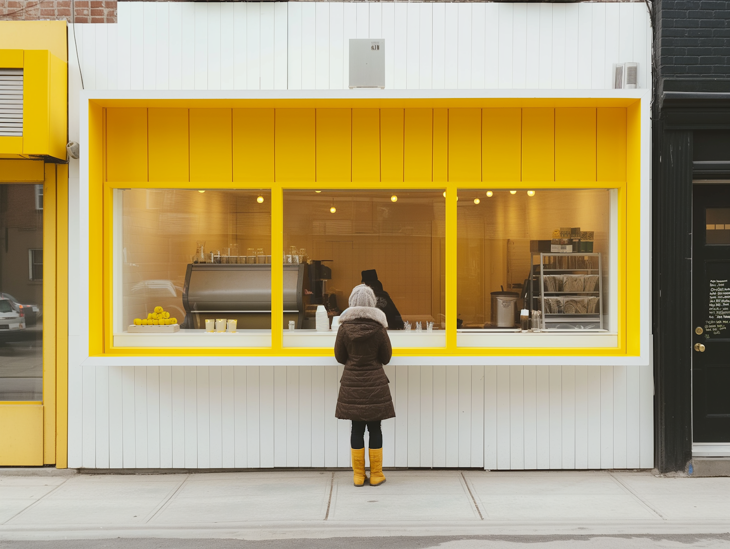 Bright yellow storefront with a person in a brown coat and yellow boots at the counter, modern design with warm interior lighting.