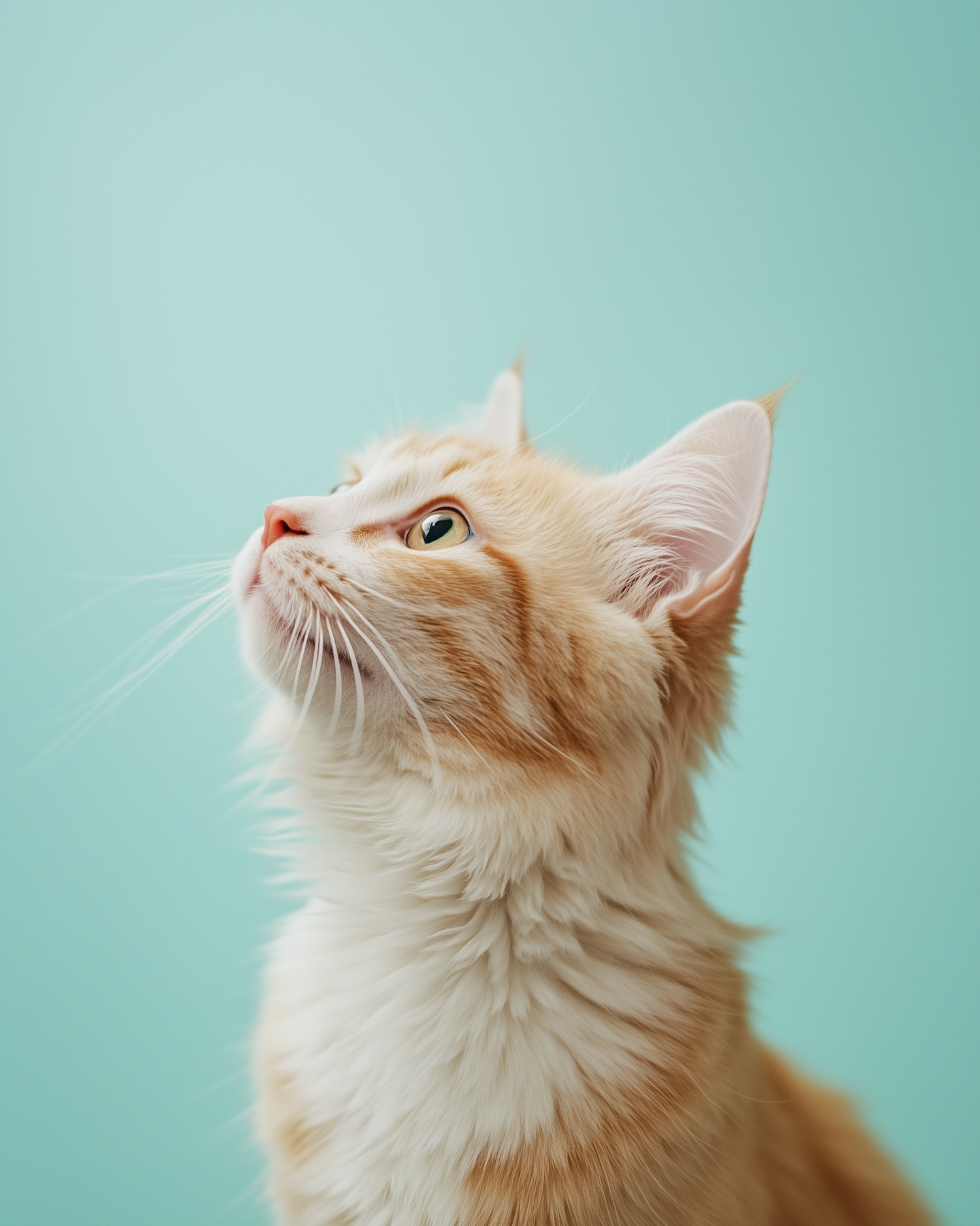 Fluffy orange and white cat with green eyes gazing upward against a teal background, showcasing its soft fur and alert expression.